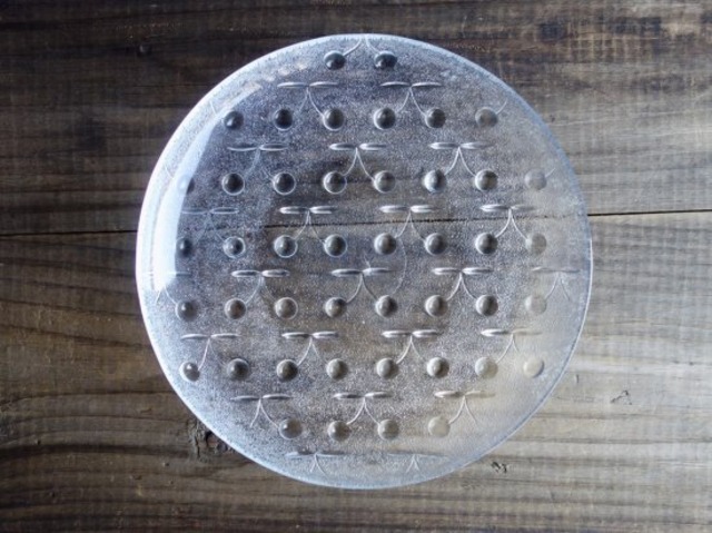 ENN scandinavian design_SELECT / from Finland ーーーーーーーーーーーーーーーーーーーーー Riihimaen lasi "KIRSI" プレート(21 cm)C ■ メーカー:Riihimaen lasi(リーヒマエン・ラシ) ■ シリーズ:KIRSI(キルシ) ■ デザイン:Nanny Still(ナニー・スティル) ■ カラー:クリア(透明) ■ サイズ(約):直径21.4 cm × 高さ2.4 cm ■ 素材:Glass(ガラス製品) ■ 製造年:1980 - 90年代 ■ コンディション:★★★☆☆ 3.9 ーーーーーーーーーーーーーーーー Riihimaen lasi "KIRSI" プレート(21 cm) "KIRSI" は「サクランボ」のこと。女性デザイナーの Nanny Still(ナニー・スティル)が1980年代にデザインを手掛けた、その名の通りサクランボがエンボス加工(絵柄などを浮き彫りにする加工方法のこと)されている可愛らしい特徴を持った人気シリーズ。 サクランボ柄はどこか甘くなり過ぎるきらいがありますが、この "KIRSI" にはシンプルな規則正しい配列、主張し過ぎないおしとやかさの様な雰囲気に包まれています。エンボス加工されたサクランボは今にもハーモニーを奏で踊り出しそうな雰囲気をしています。 Riihimaki(リーヒマキ)社は 1910年に設立され 1937年にRiihimaen lasi へと社名変更を経て1990年頃まで続いたフィンランドのガラスメーカー。Nanny Still(ナニ―・スティル)、Tamara Aladin(タマラ・アラディン)、Helena Tynell(ヘレナ・ティネル)などの優れたデザイナーと共に歩み続けましたが、今は無きメーカーです。現在でも色褪せることのない作品達は希少なアンティークコレクションとして輝き続け、これからも受け継がれていくことでしょう。 お皿のセンターに見られる跡は当店にある複数在庫全てに少なからず感じる跡と言え製作跡になります。その他細かな擦れやカトラリー跡などの使用感は薄っすら僅かで、欠けや割れなど見られないことから、時を刻んで来たガラスの器として概ね良好な状態と言えます。※ガラス製品特有のゆらぎ、シワやスジ、模様などの個体差、加工時の小さな気泡や小キズなど出ている可能性はございます。 【表面】 サクランボ柄は裏からエンボス加工され表面にも見えていますので表面はツルッと滑らかでお手入れし易くなっています。中央に製作跡と言えるうねりスジ(画像4)は見られるものの、その他細かな擦れやカトラリー跡など使用感は殆ど見当たらず綺麗な状態です。※表面ゆらぎによるクモリ濃淡や構造上のサークル跡(中心部)は見られる状態です。 【縁】 綺麗な状態です。縁に軽いゆらぎを感じますが、一枚一枚手作業で作られた証の様なものと言えます。 【裏面】 エンボス加工されたサクランボの頂点部分(座を兼ねてる部分)に薄っすら僅かな擦れ(画像7)を感じる箇所がある程度で概ね良好な状態と言えます。 規則正しく並んだサクランボのサイズ感や表情がとても可愛らしく美しいガラスの器を迎え入れてみませんか。何でもかんでもとはいきませんが、万能的なお皿として色んなシーンで可愛らしい活躍が期待できます。