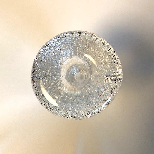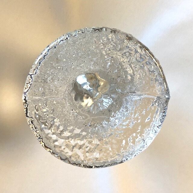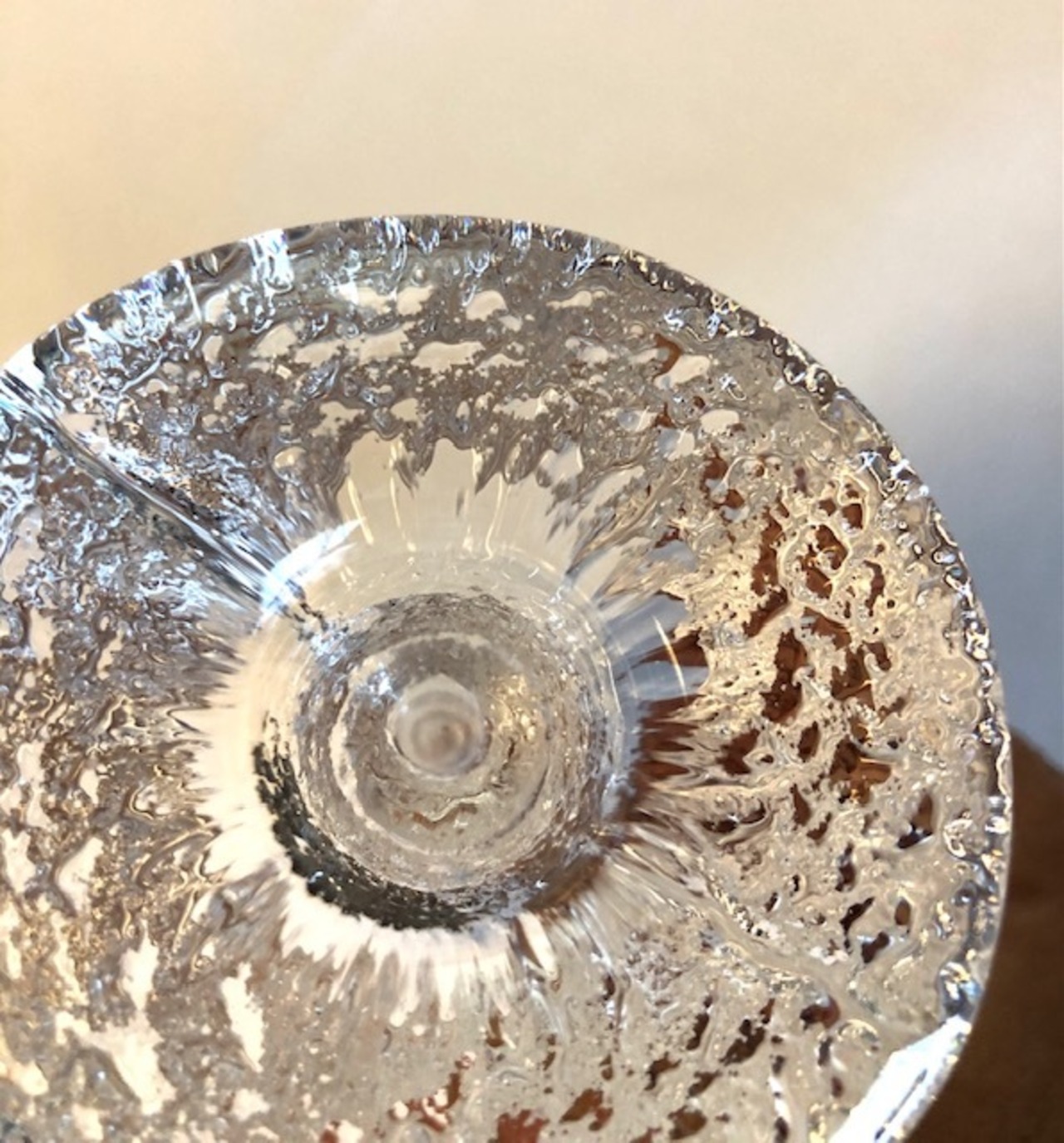 氷の塊を削って象られた様なフォルムは正に氷の彫刻と言えると思います。真上から見た時は水々しい氷で表面は滑らかでつるっとしています。次いで横から見ると表面がザラッとした見た目と触り心地をしており、どこから見ても表情豊かで楽しませてくれる神秘的な美しさを放ちます。非常に存在感があり、手に持った時の重厚感はロウソクを実際に立てた時の安定感をもたらします。上部の中心のくぼみにロウソクを差し込んでお使いいただく形となりますが、穴には若干の個体差があるためロウソクの形状によってはうまく立たなかったりぐらついたりする場合があるかと思いますが、IKEAなどで購入出来るロウソク / JUBLA(ユーブラ)は非常に安定して立てる事が出来ると言われています。