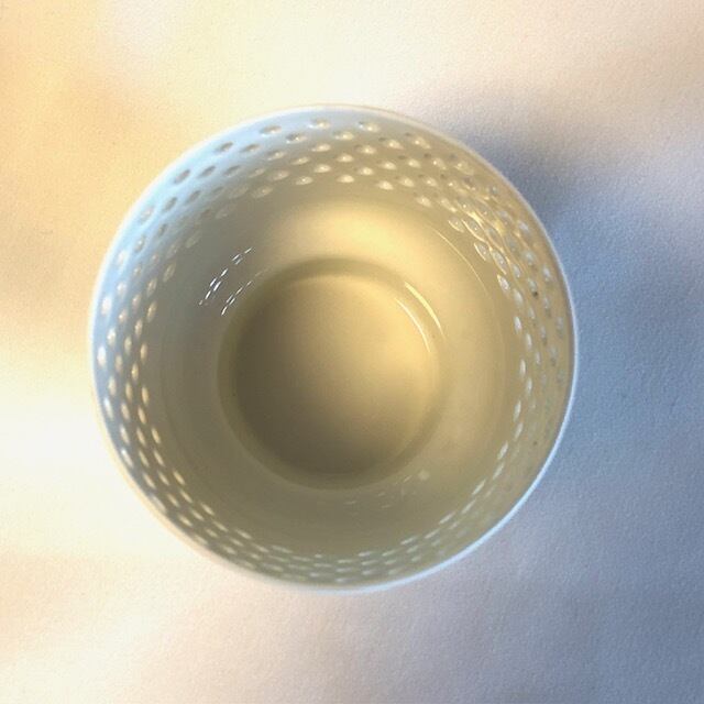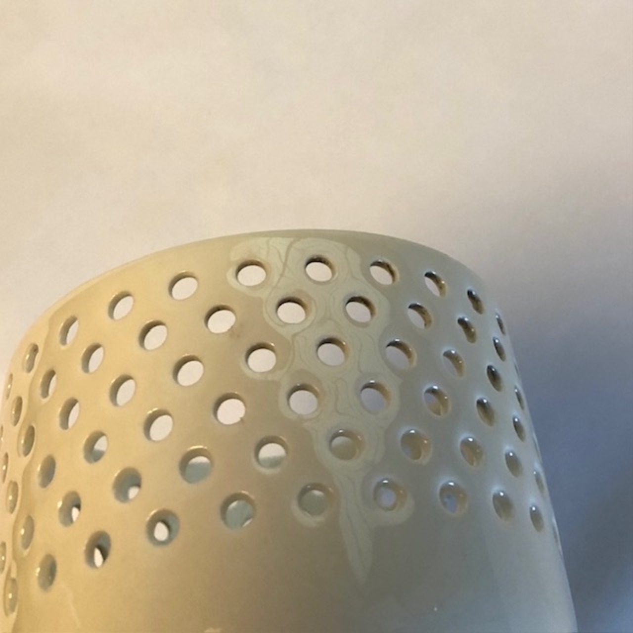 真っ白なフォルムにドット穴を纏ったキャンドルホルダーは水玉模様を壁などに映し出す楽しみも味わえます。丸穴内部の釉薬ムラは若干見られる可能性はありますが綺麗な状態です。