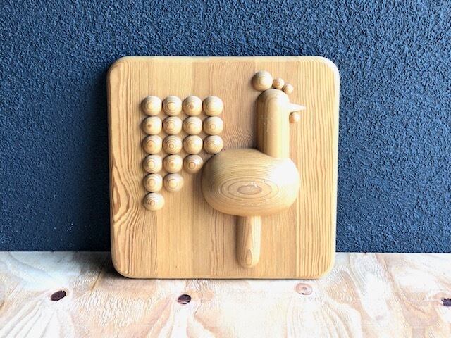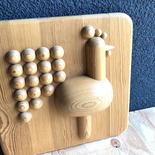 aarikka 雄鳥の置物をそのまま木のプレートに埋め込んでいるかのように作られた壁掛