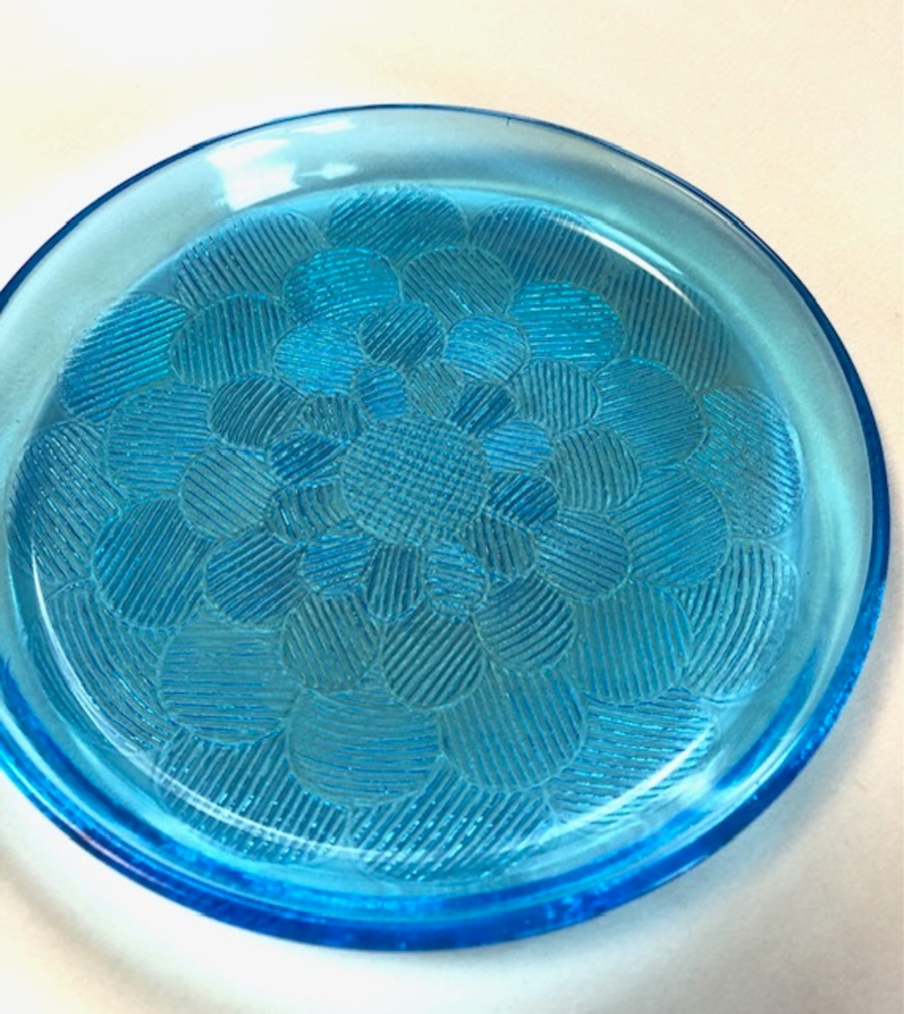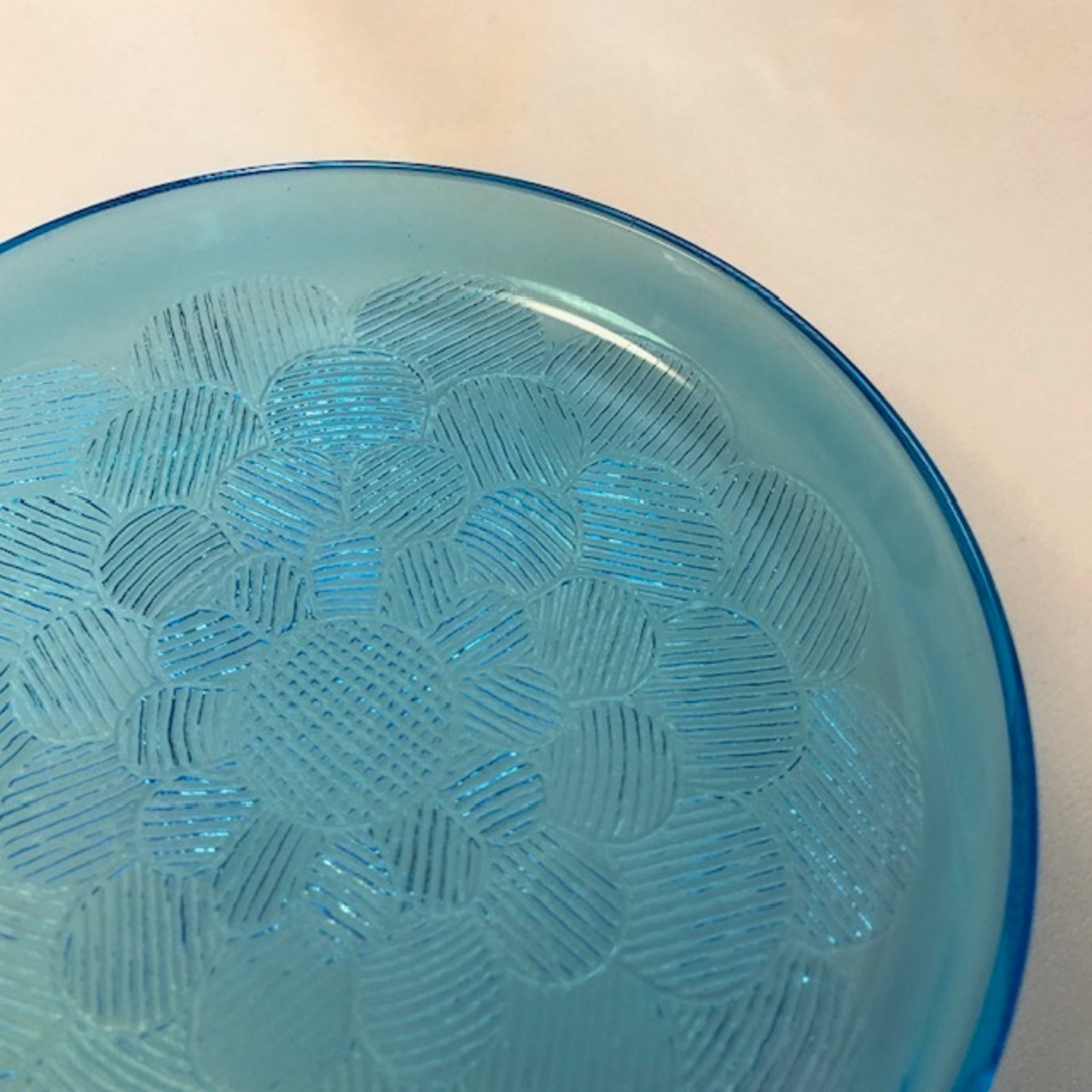 経年による風合いの変化、細かな擦れや小キズなどのカトラリー跡は多少見られはするものの、目立つ擦れ、キズ、汚れなど見当たらず、欠けや割れなど見られないことから、時を刻んで来たガラスの器として比較的綺麗な状態と言えます。※ガラス製品特有のゆらぎ、シワやスジ、模様などの個体差、加工時の小さな気泡や小キズなど出ている可能性はございます。