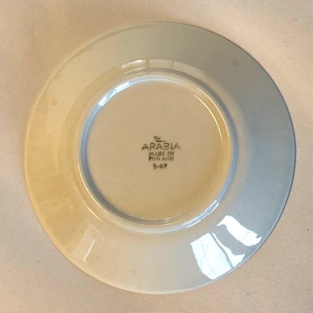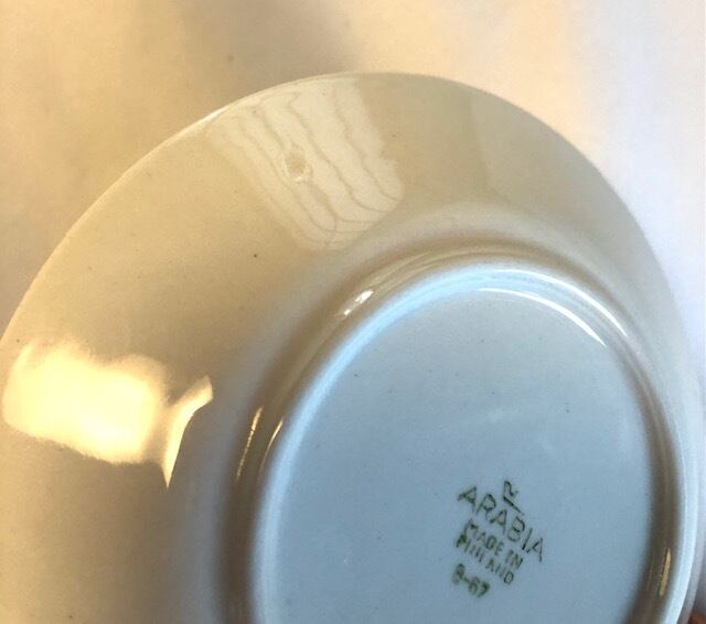 真っ白です。細かな擦れや微キズなど少し感じる箇所はあるものの、概ね綺麗な状態と言えます。釉薬ムラくすみの様な跡や焼成時の支柱跡など少し見られる箇所はございます。ARABIA MADE IN FINLAND 旧ロゴバックスタンプが残されています。