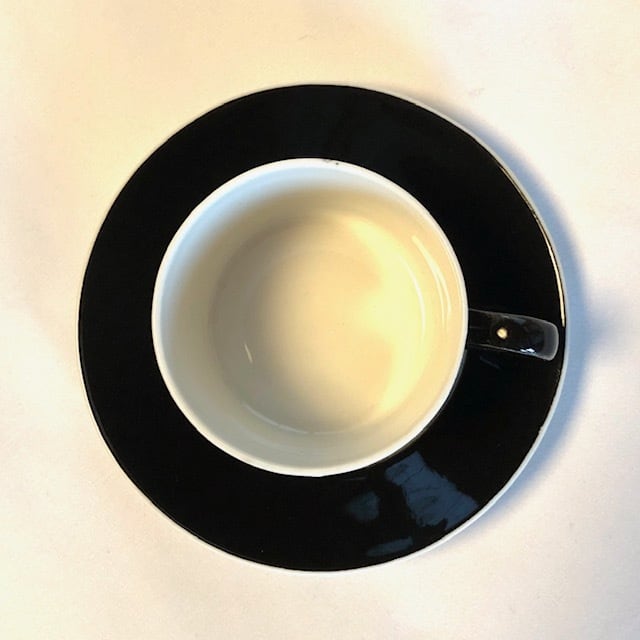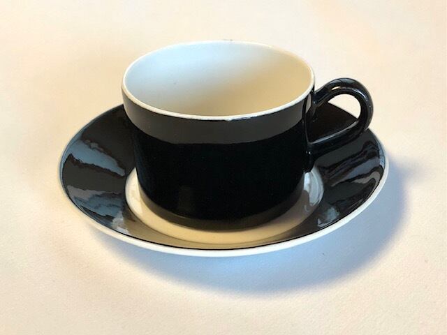 小振りでデミタス向けのカップは側面・持ち手・裏面高台内が艶感のあるブラック、その他はホワイトで、モノトーンツートンカラーになります。ソーサーはリムの傾斜が強く、リム表面にのみカップと同色のブラックデコレートがされています。