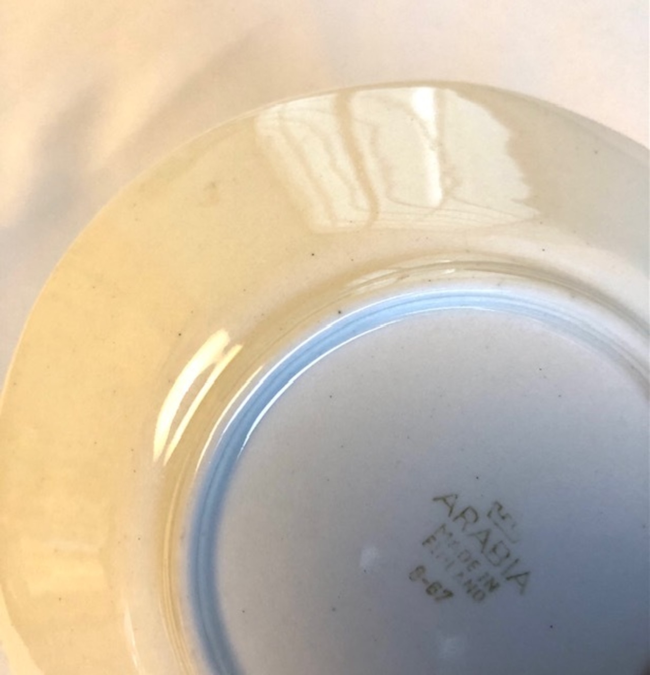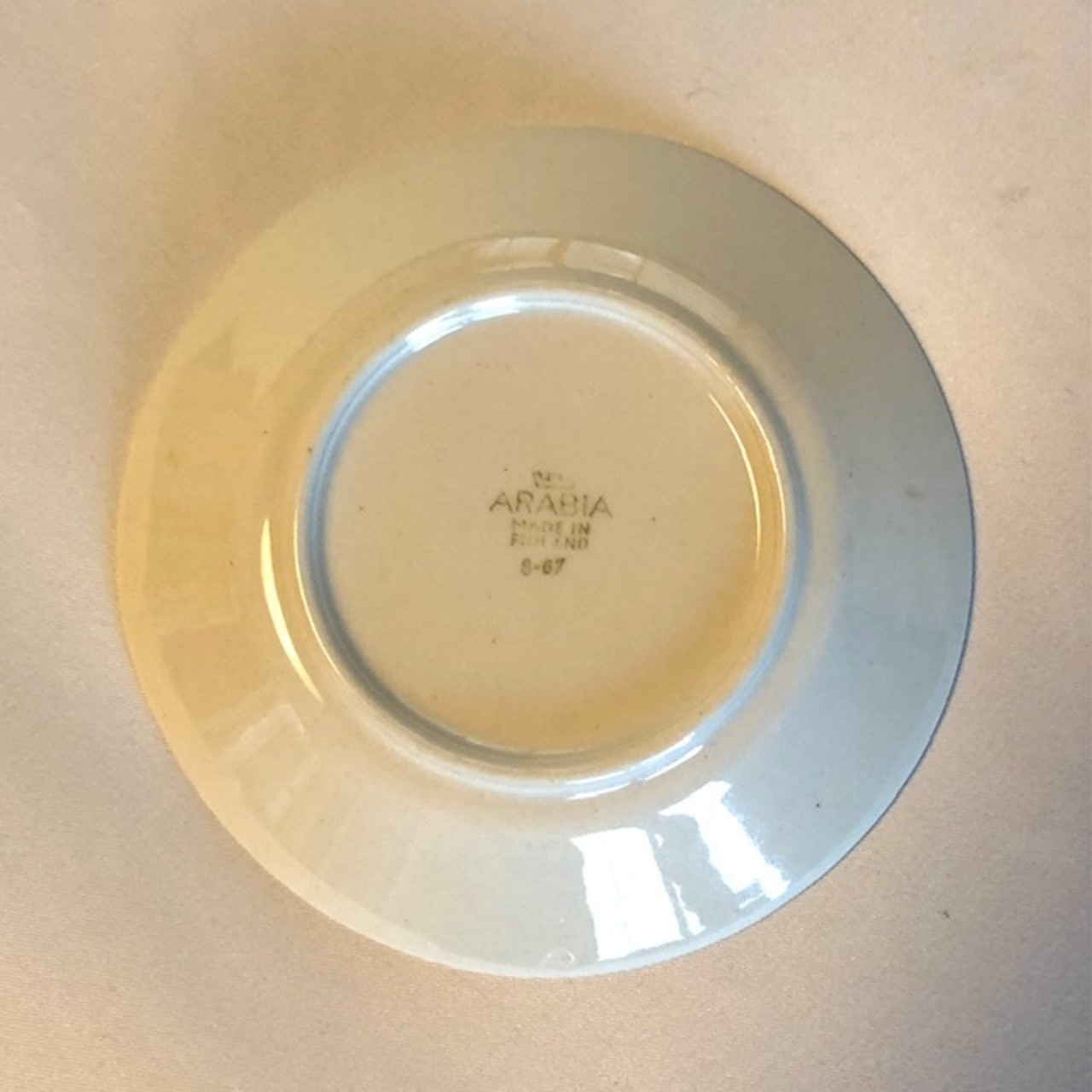 真っ白です。細かな擦れや微キズなど少し感じる箇所はあるものの、概ね綺麗な状態と言えます。釉薬ムラくすみの様な跡や焼成時の支柱跡など少し見られる箇所はございます。ARABIA MADE IN FINLAND 旧ロゴバックスタンプが残されています。