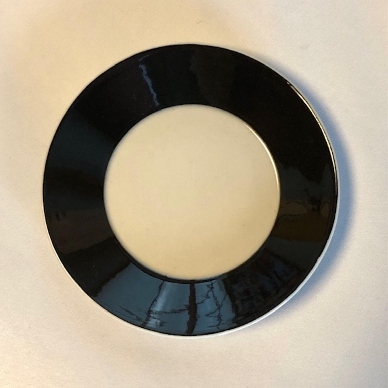 ベースは白でリム部の表面のみがカップと同じブラックデコレートされています。このツートンモノトーンが美しいのです。カトラリー跡と言える細かな擦れや微細キズなど多少見られるものの、薄っすら感じる程度で概ね綺麗な状態と言えます。