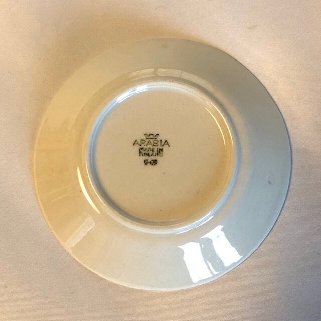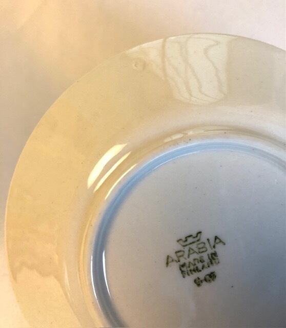 真っ白です。細かな擦れや微キズなど少し感じる箇所はあるものの、概ね綺麗な状態と言えます。釉薬ムラくすみの様な跡や焼成時の支柱跡など少し見られる箇所はございます。ARABIA MADE IN FINLAND 旧ロゴバックスタンプが残されています。