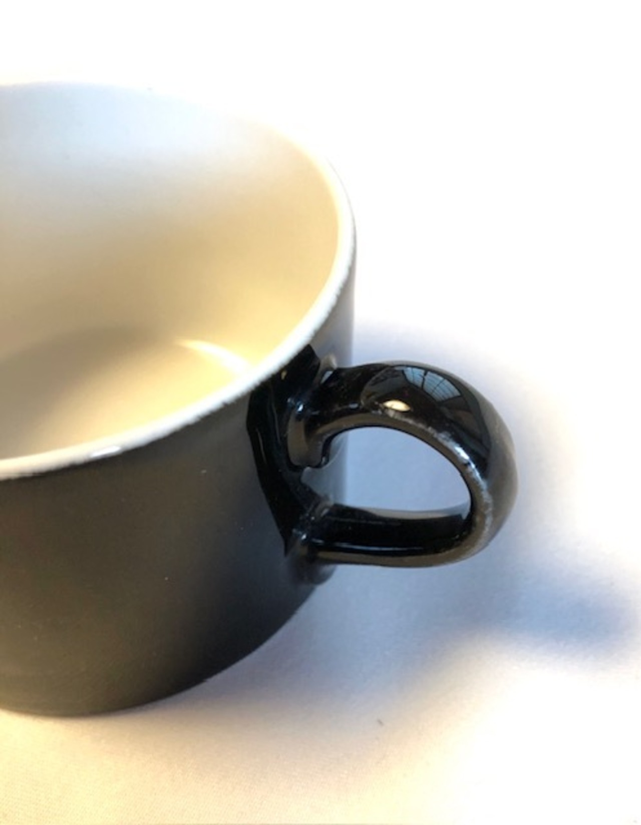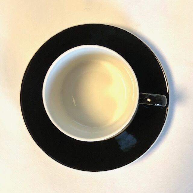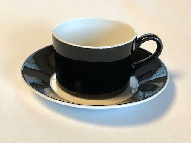 小振りでデミタス向けのカップは側面・持ち手・裏面高台内が艶感のあるブラック、その他はホワイトで、モノトーンツートンカラーになります。ソーサーはリムの傾斜が強く、リム表面にのみカップと同色のブラックデコレートがされています。