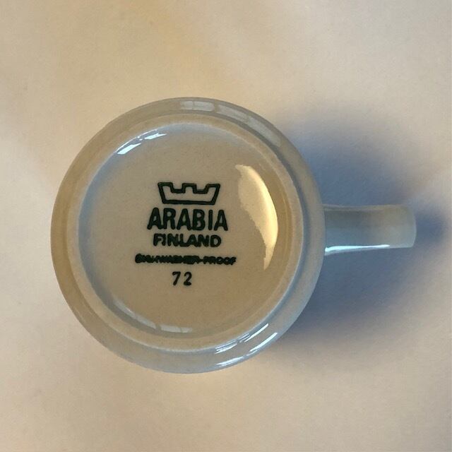 細かな擦れ、座の擦れやくすみなど見られますが、いずれも目立つ跡ではなく比較的綺麗な状態と言えます。ARABIA 旧ロゴのバックスタンプが残されており、食洗機可とされています。