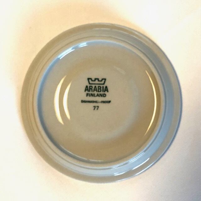 細かな擦れ、座の擦れやくすみなど薄っすら見られるものの、概ね良好な状態と言えます。ARABIA 旧ロゴのバックスタンプが残されており、食洗機可とされています。