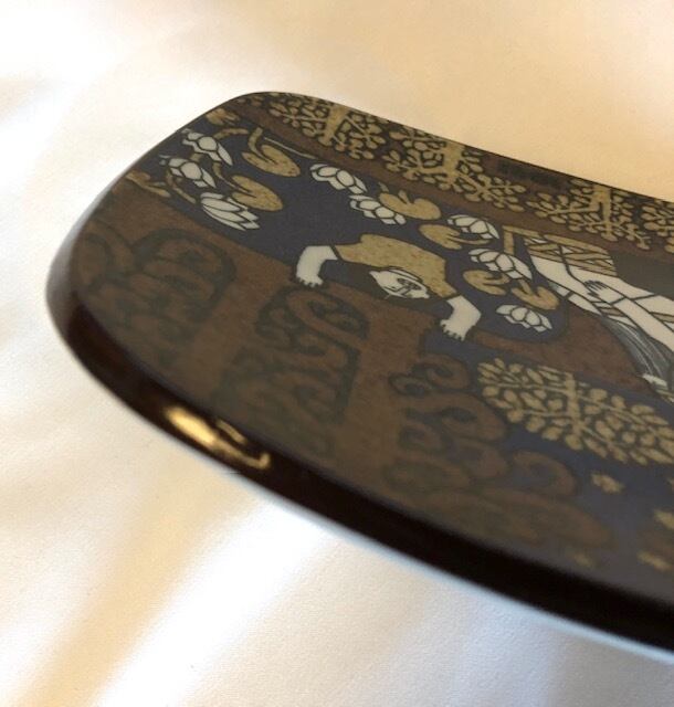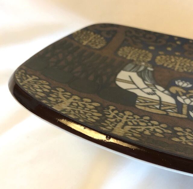 製作跡と言える釉薬ムラくすみのような跡は見られるものの、綺麗な状態です。フィンランド語・スウェーデン語・英語で絵柄の説明が記載され、壁掛け用の穴と金具が用意されています。