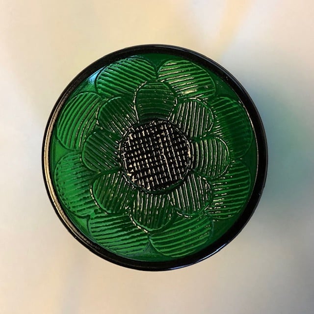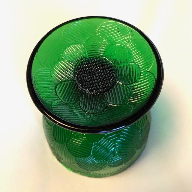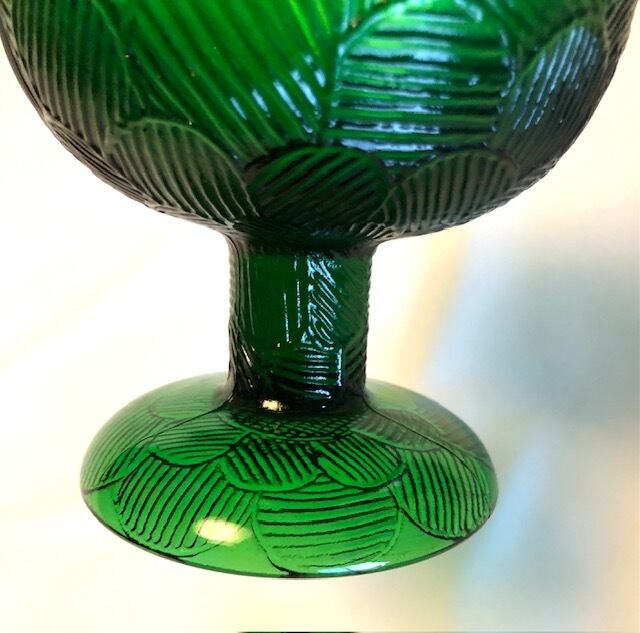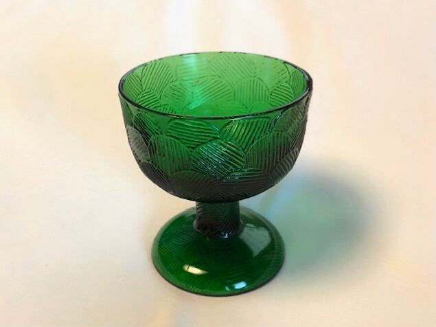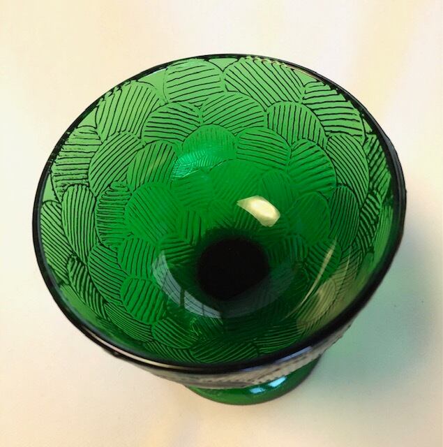 "Miranda" は Heikki Orvola によって1970年代に手掛けられたシリーズで、花びらが「ウロコ・おはじき」みたいに描かれた特徴を持つ大変可愛らしいデザインです。土台の裏面にまで可愛らしく花びらが象られ、どこから見ても美しい模様とフォルムは圧巻です。こちらはグリーン色の脚付デザートボウルです。美しくデザインされた土台(座)がしっかりとボウル部分を支えているようなデザインで、ぽってりと愛嬌たっぷりな一面にも惹かれる逸品です。
