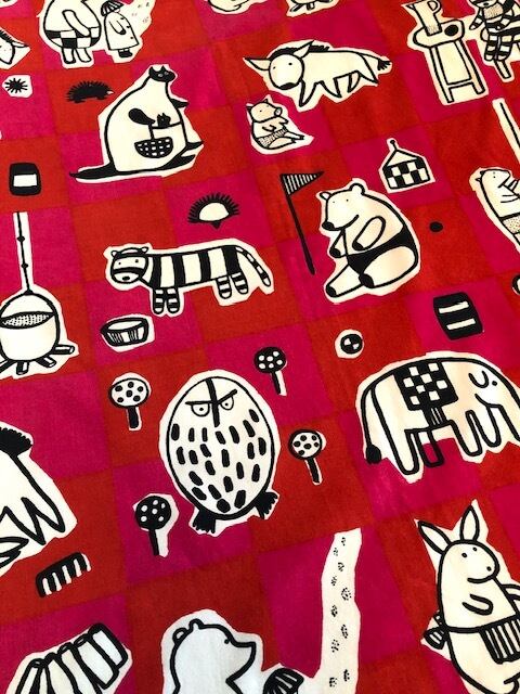 "NALLE" は「テディベア」という意味を持ちます。1956年に Maija Isola(マイヤ・イソラ)によってクマさんの暮らしぶりを、子供達と一緒に大人も楽しめるような雰囲気で描かれている作品です。こちらの色味は赤と赤ピンク色で構成されたブロックチェック地をベースに、クマさんや動物、日用品などは黒と白で描かれております。