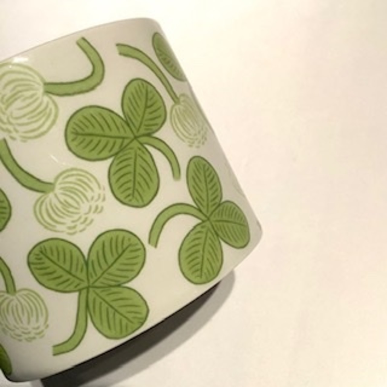 “Apila”とは「クローバー」と言う意味で、その名の通り、三つ葉や四つ葉のクローバーと花が優しげに緑色の濃淡で描かれ彩られています。※フォルムデザインにつきましては、カイピアイネンの代表作 “Paratiisi”(パラティッシ)と同じデザインで、使い易さなどお墨付きです。