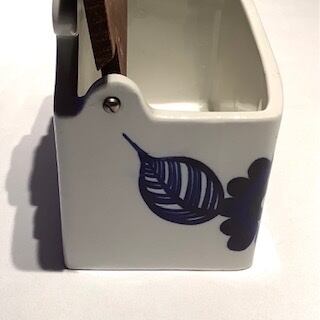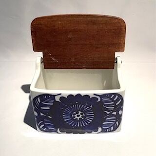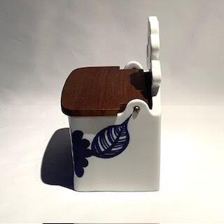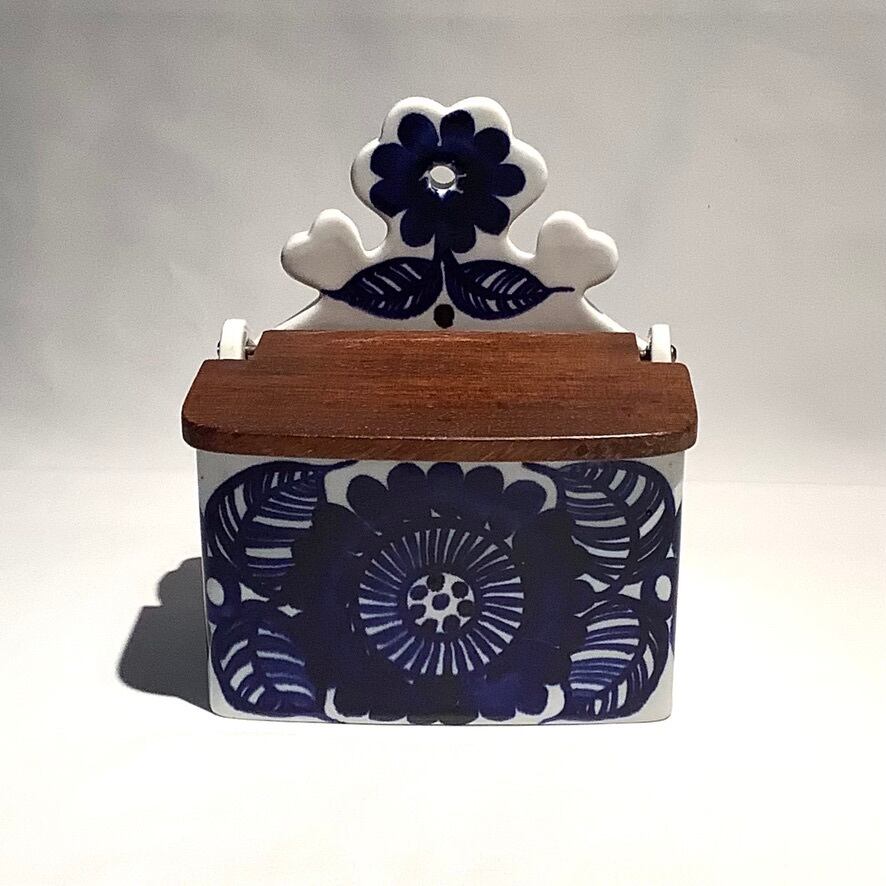 “Kookki” は 1960-76年にかけて Gunvor Olin-Gronqvist(グンヴァル・オリン・グラングヴィスト)がデザインを手掛けたシリーズで、ハンドペイントで大胆に描かれたお花が最大の特徴と言え、元気でワクワクするような存在感を放っています。他にもカッティングボードやバターケースなど色々と展開されたシリーズですが、こちらは木製蓋を開け閉めできるソルトケースになります。また、空間や用途によって直置きも良し、壁掛けも良しな選択肢のあるデザインと言えます。
