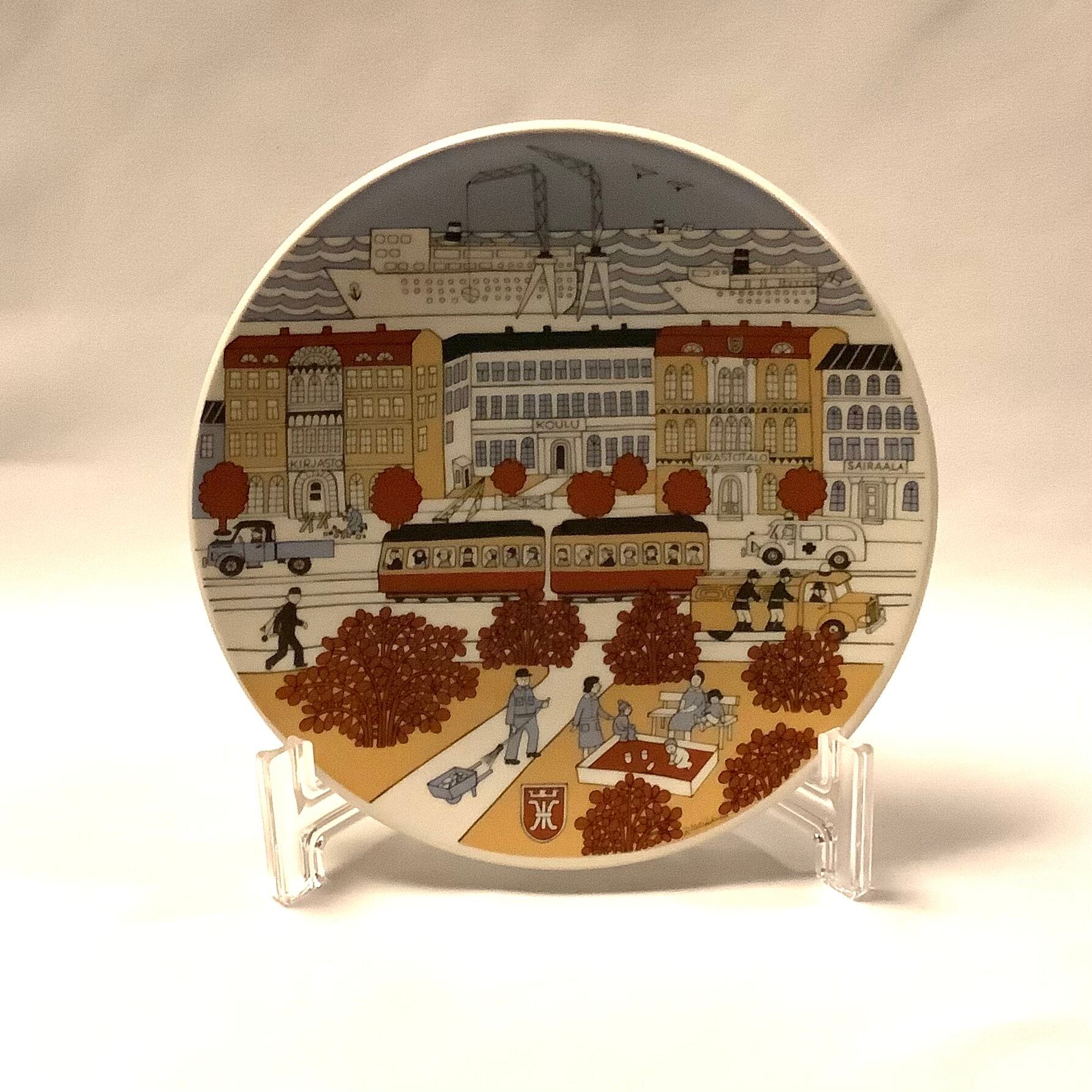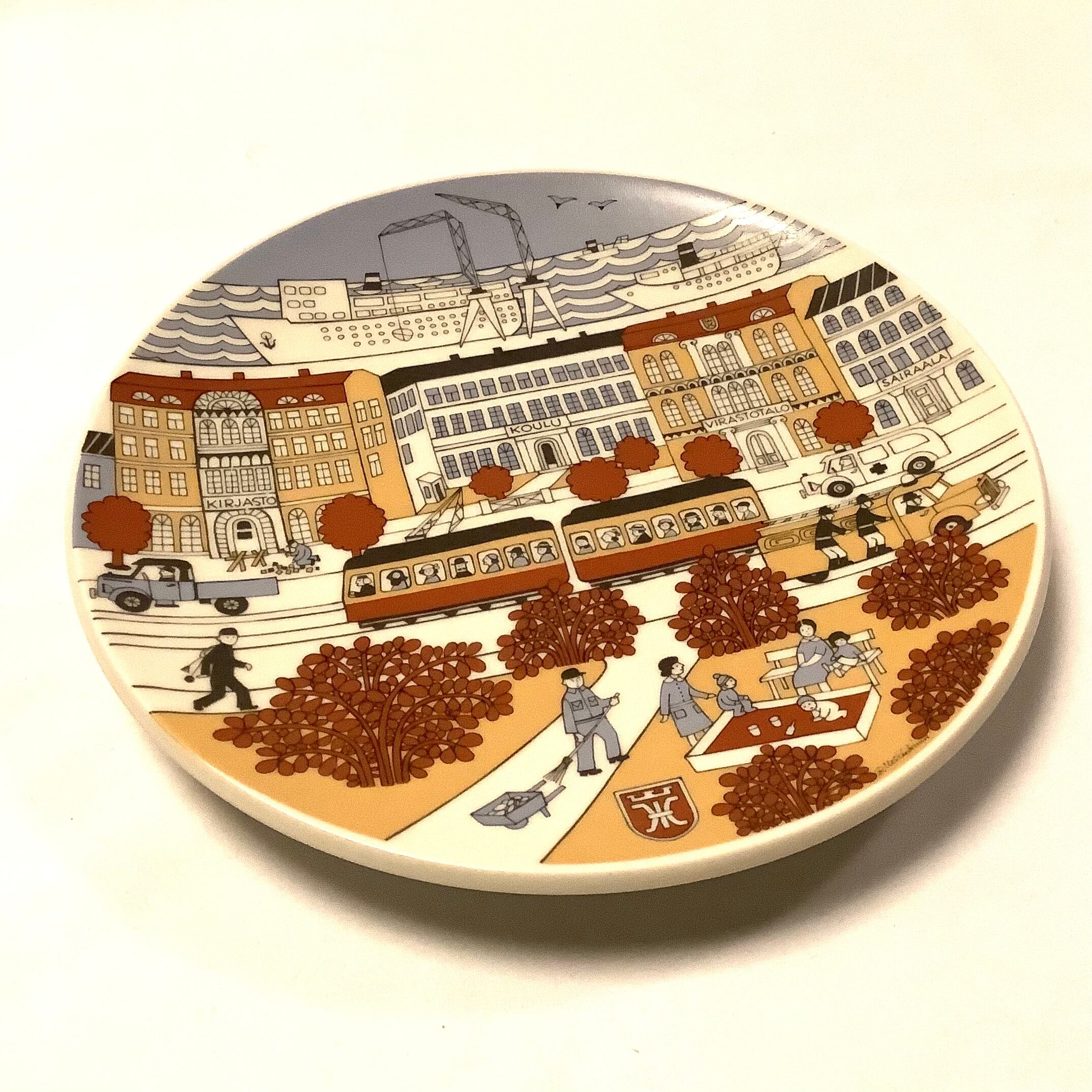 別注品ならではの別品プレートには公務員や建物などが描かれているのが特徴的で、プレート中段右から"SAIRAALA"(病院)、"VIRASTOTALO"(庁舎)、"KOULU"(学校)、"KIRJASTO"(図書館)、プレート奥には港湾施設、中央やや下にはトラムや消防車、救急車などの乗り物とスタッフ(職員)たち、その他に市の管轄する公園を綺麗にする清掃員、図書館前は工事の真っ最中の様子が描かれ、港の船にはフィンランド国旗やカモメの飛来、庁舎にはKTVマークまでもが細かく描かれています。