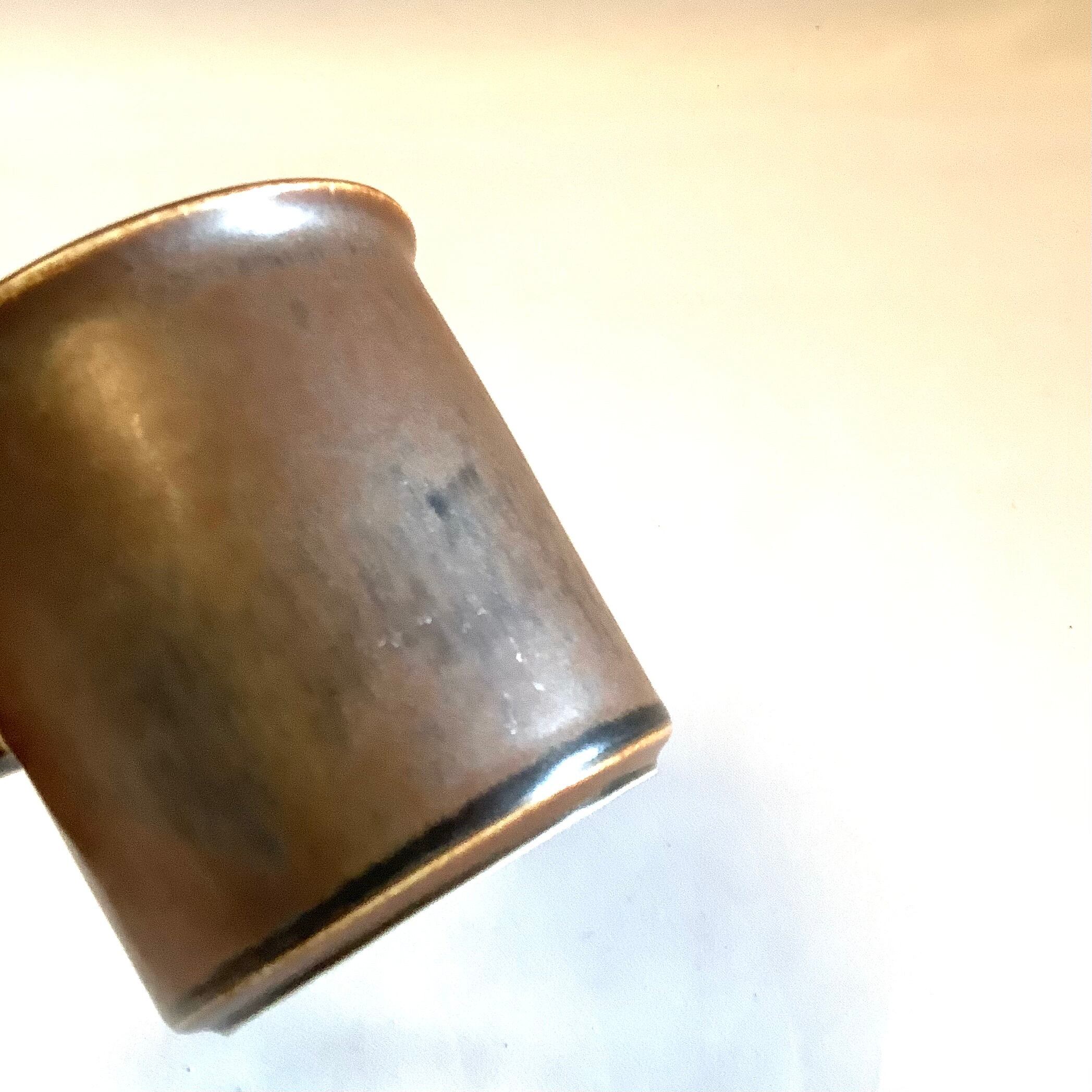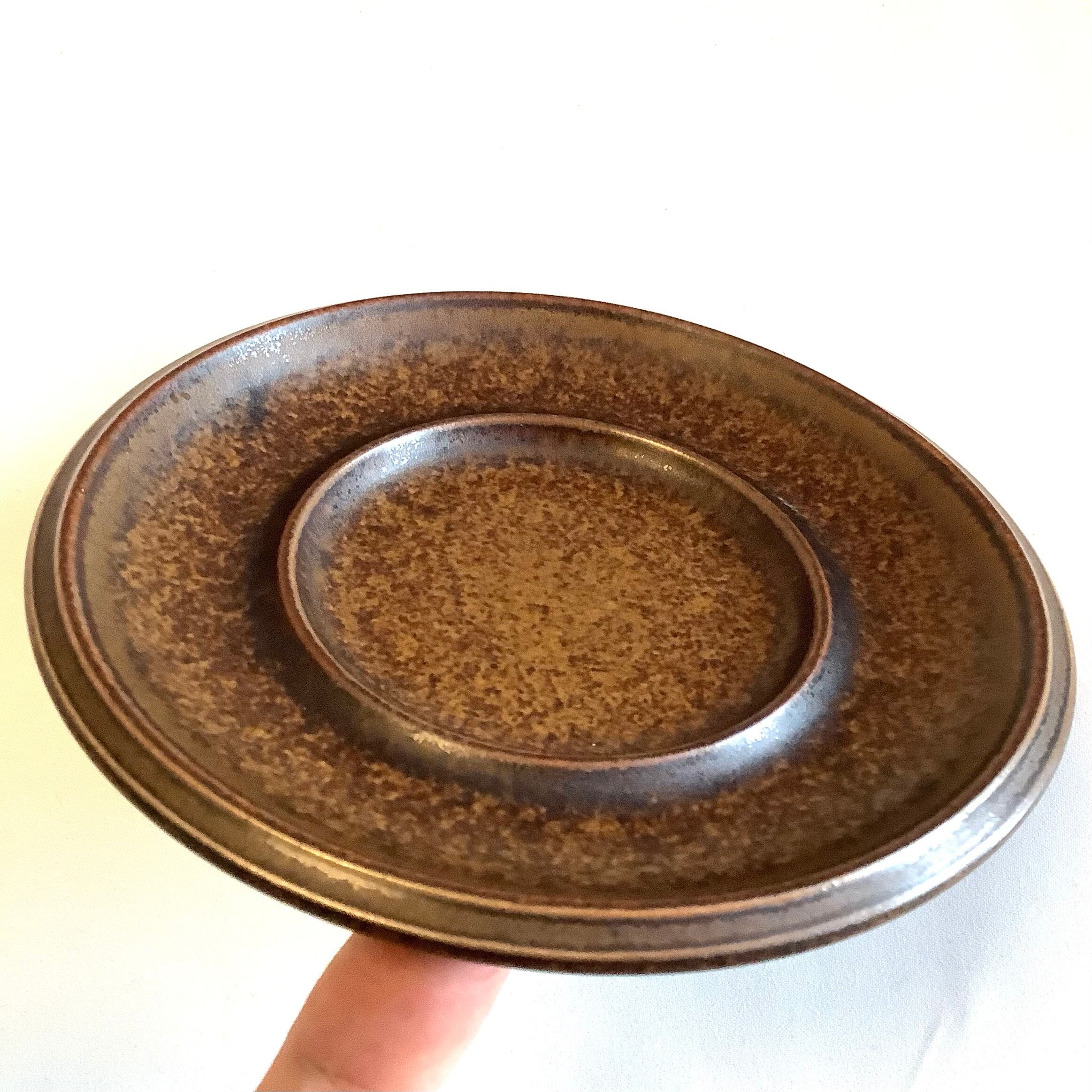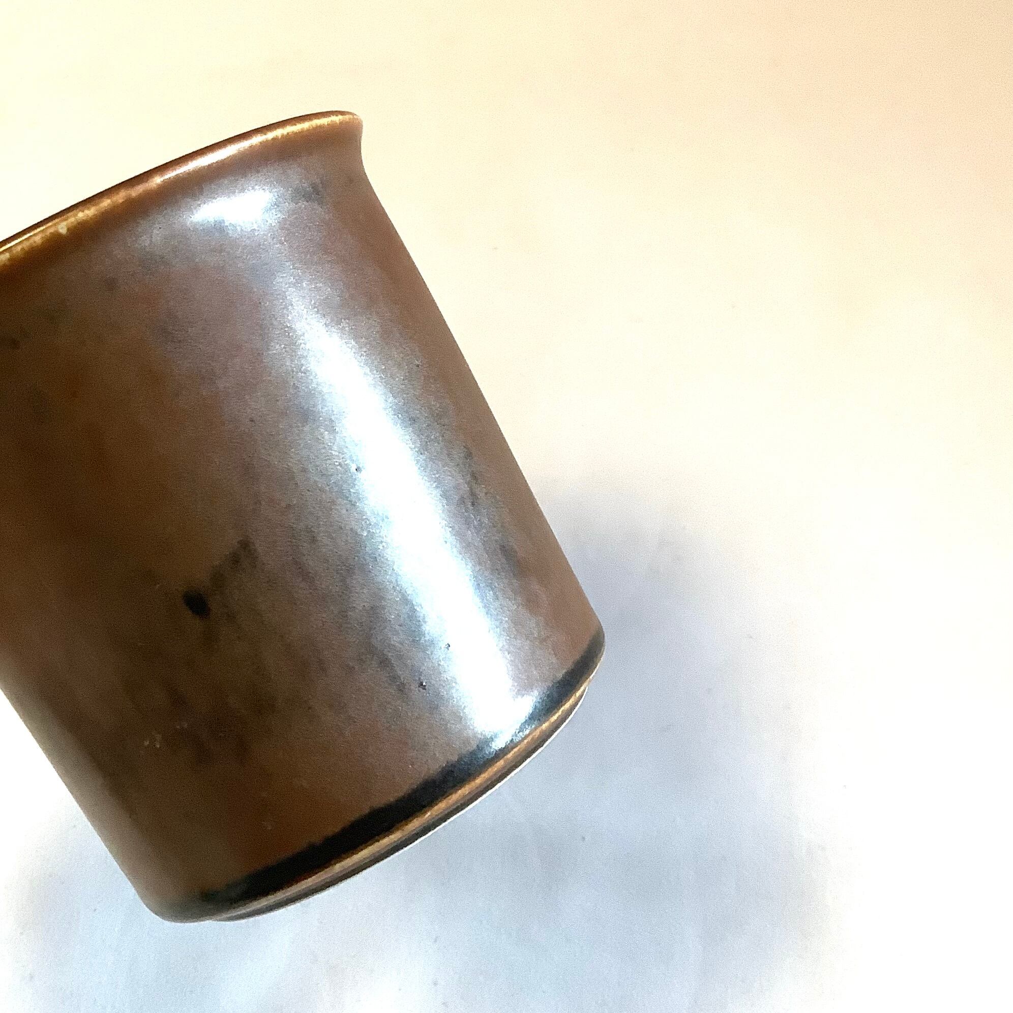 釉薬や条件によって茶色の中に炭黒色を混じえた独特な表情を放っています。細かな擦れなど薄っすら僅かに感じる程度で概ね良好な状態と言えます。※ペン先程の小さな点凹跡は製作焼成時の跡になります。