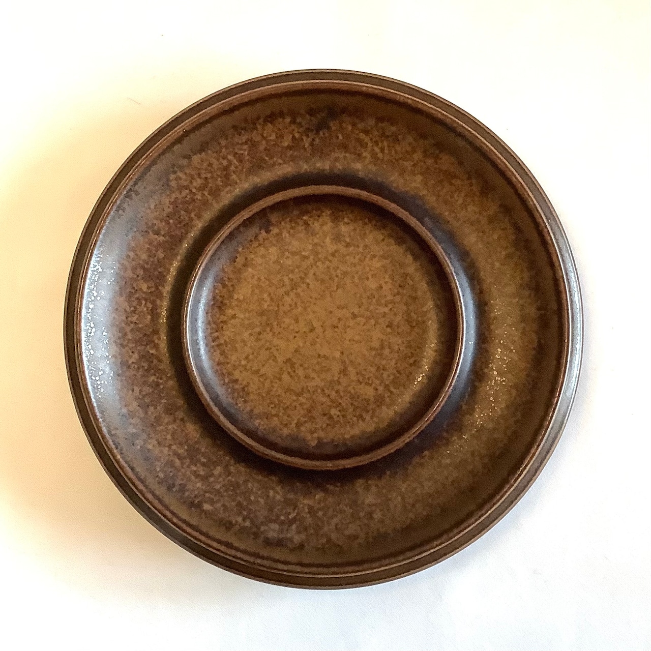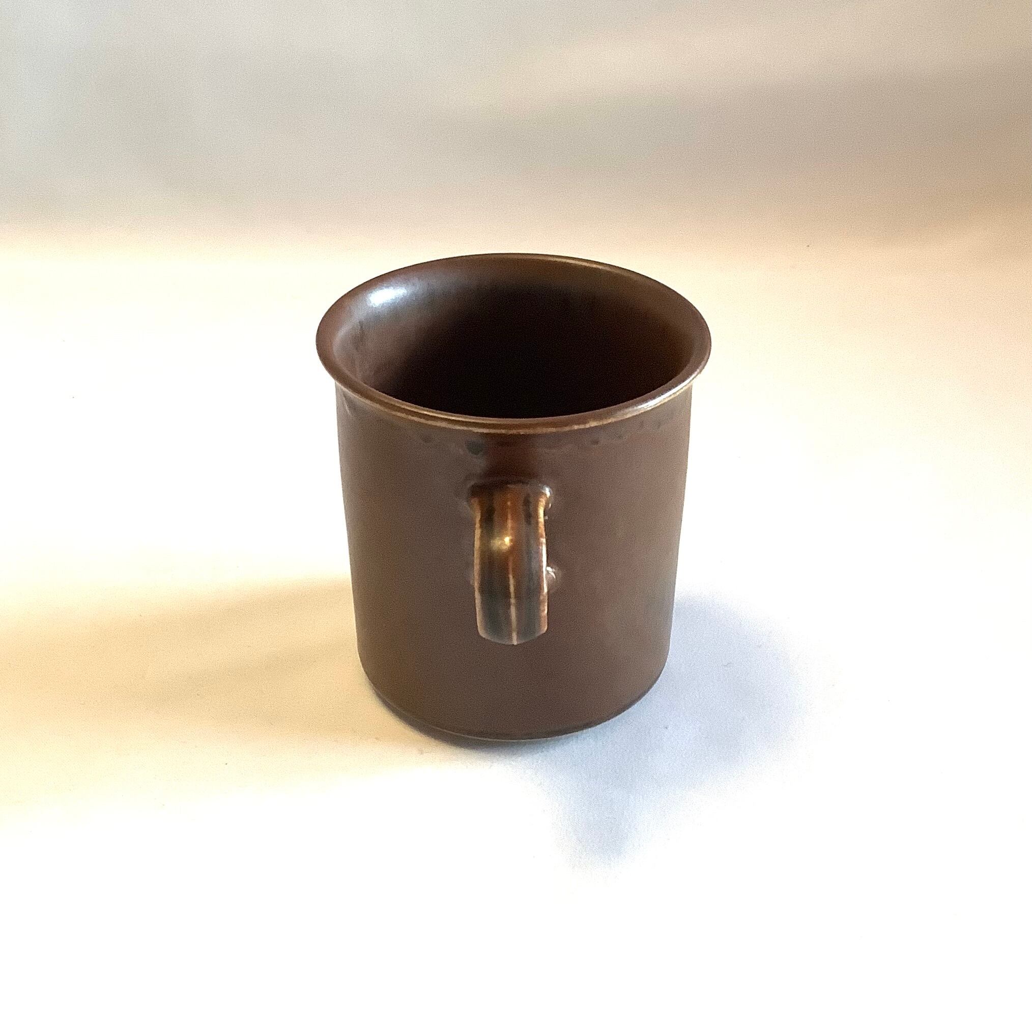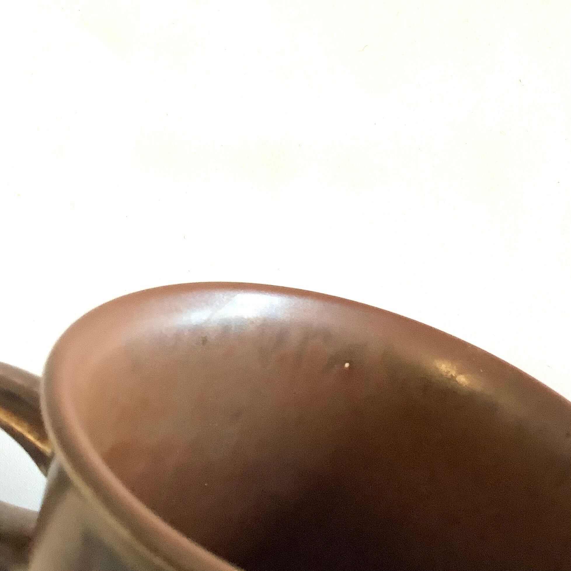 釉薬や条件によって茶色の中に炭黒色を混じえた独特な表情を放っています。細かな擦れなど薄っすら僅かに感じる程度で概ね良好な状態と言えます。※ペン先程の小さな点凹跡は製作焼成時の跡になります。