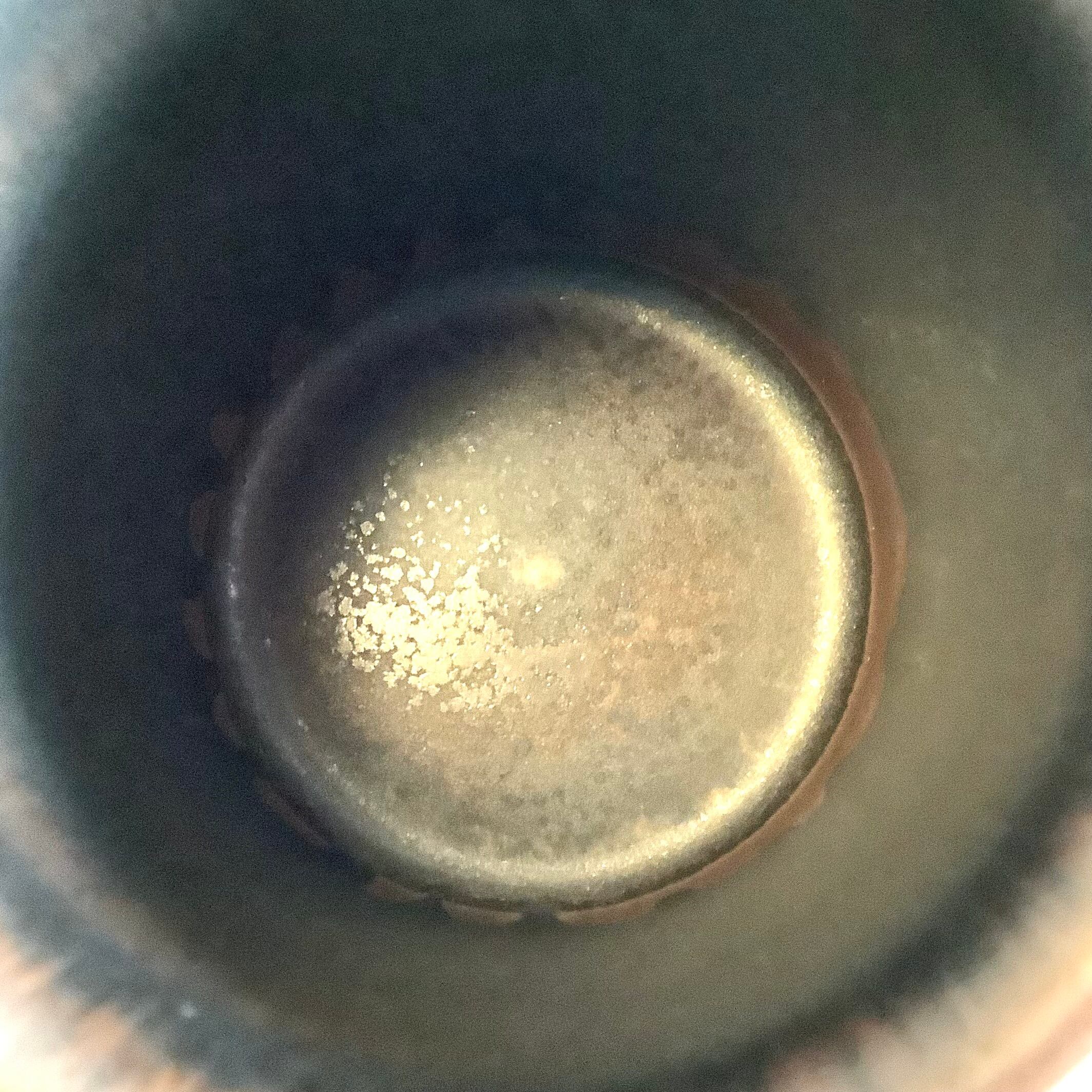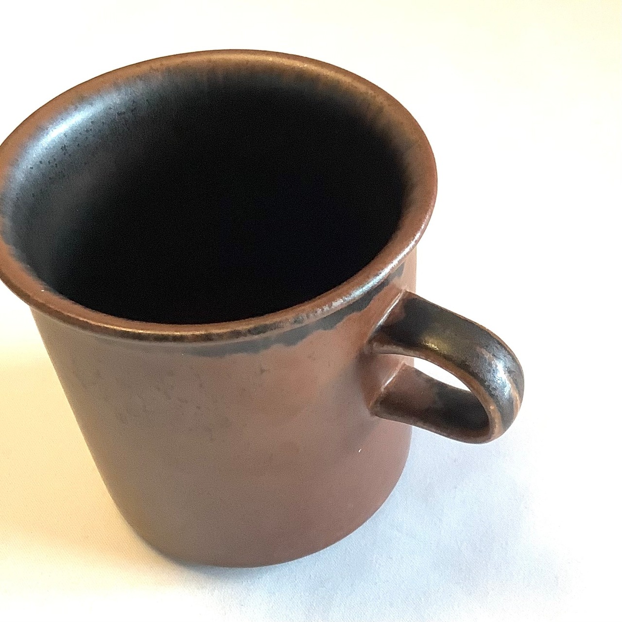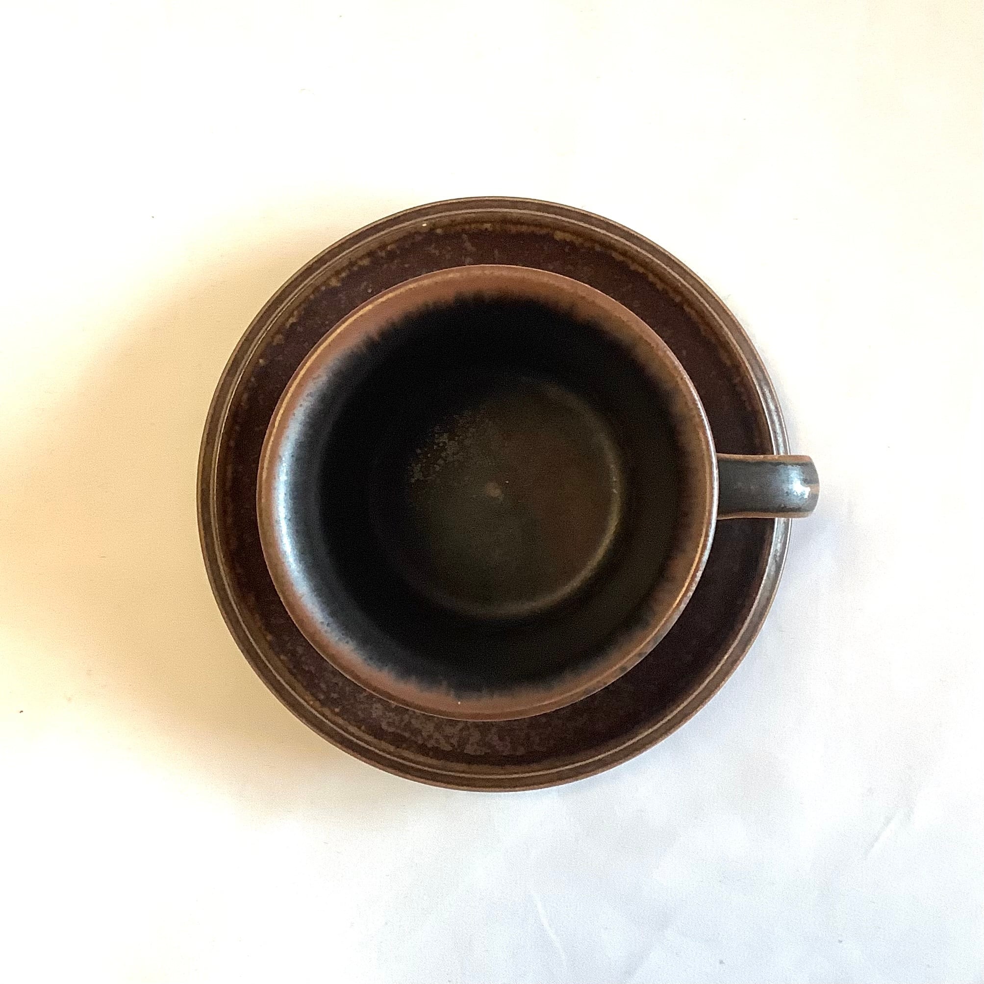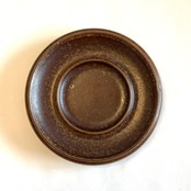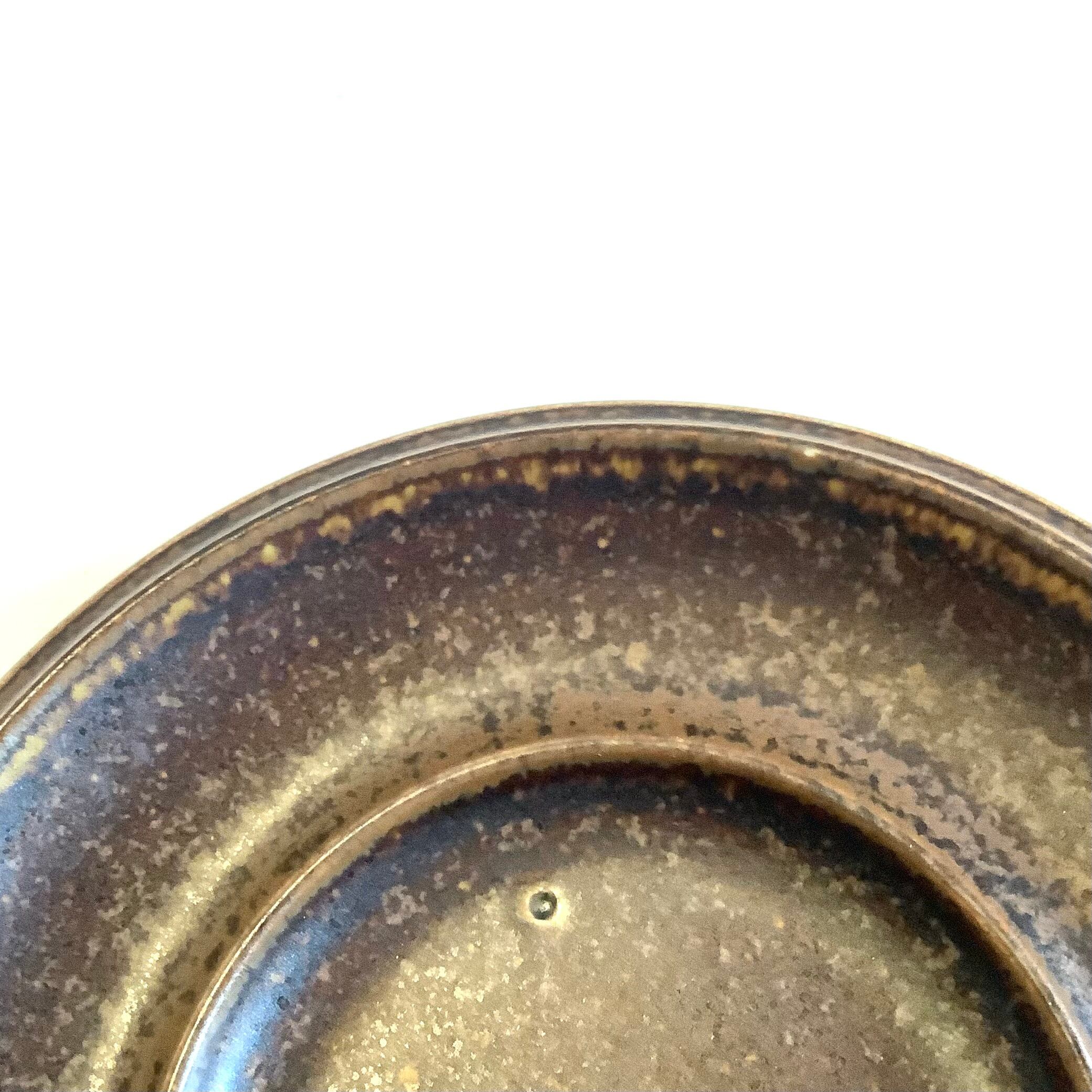 釉薬や条件によって茶色地に炭黒色が広い範囲重なったような独特な表情を放っています。カトラリー跡と言える細かな擦れや微細キズなどの使用感は薄っすら少し感じる程度で概ね綺麗な状態と言えます。