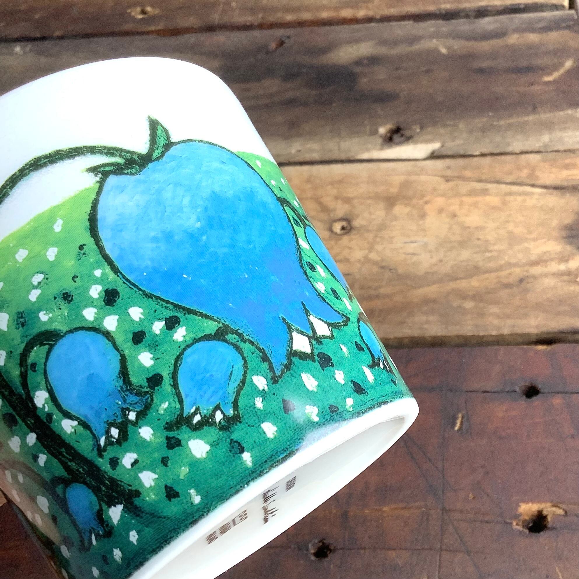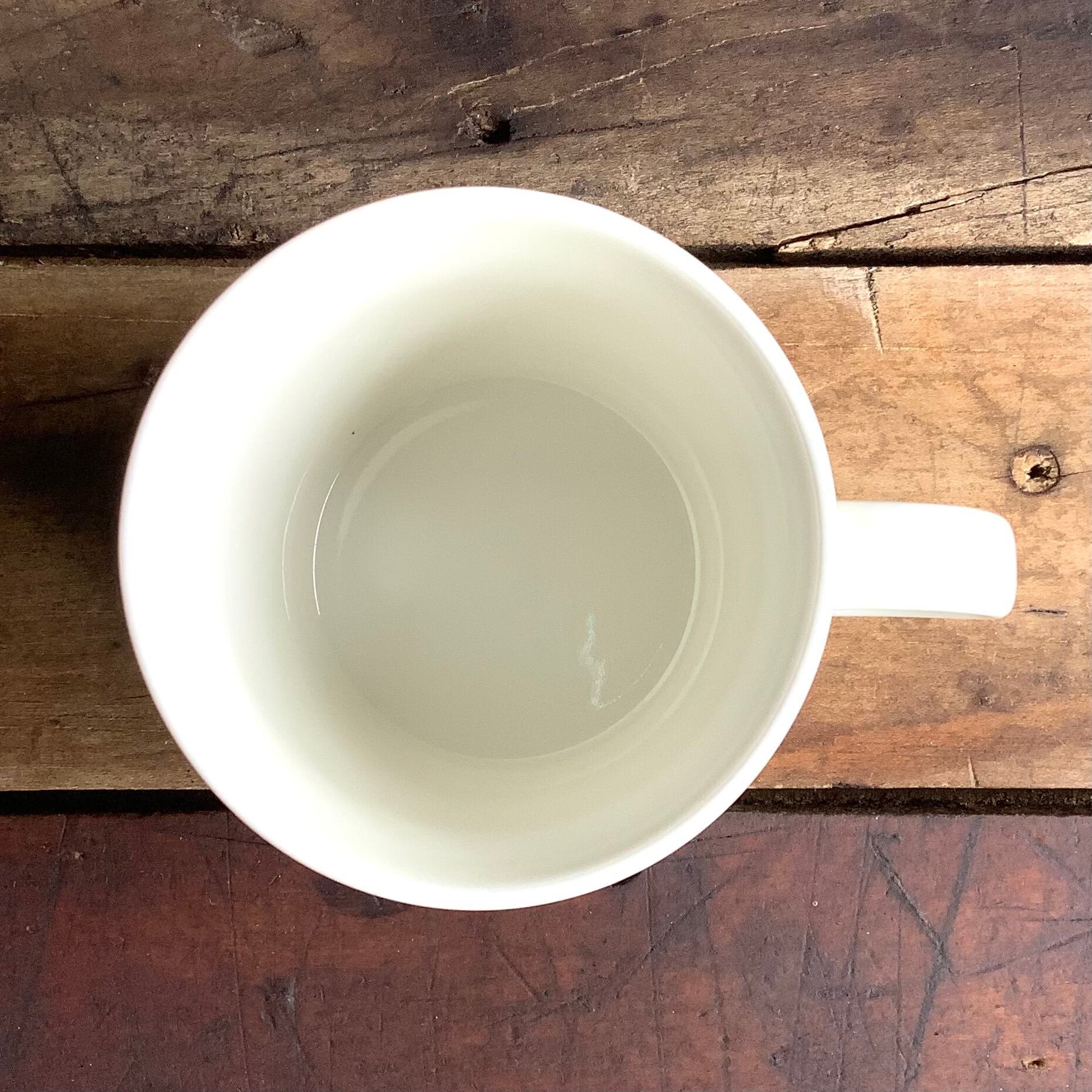 ホワイト Teema マグカップベースの表面(側面)ほぼ全体に "Bluebell" の花が咲き誇り、まるでデザイナー自信がそこに降り立ち、ありのままを油絵のようなタッチで描いた絵図をプリントされたものと想像します。