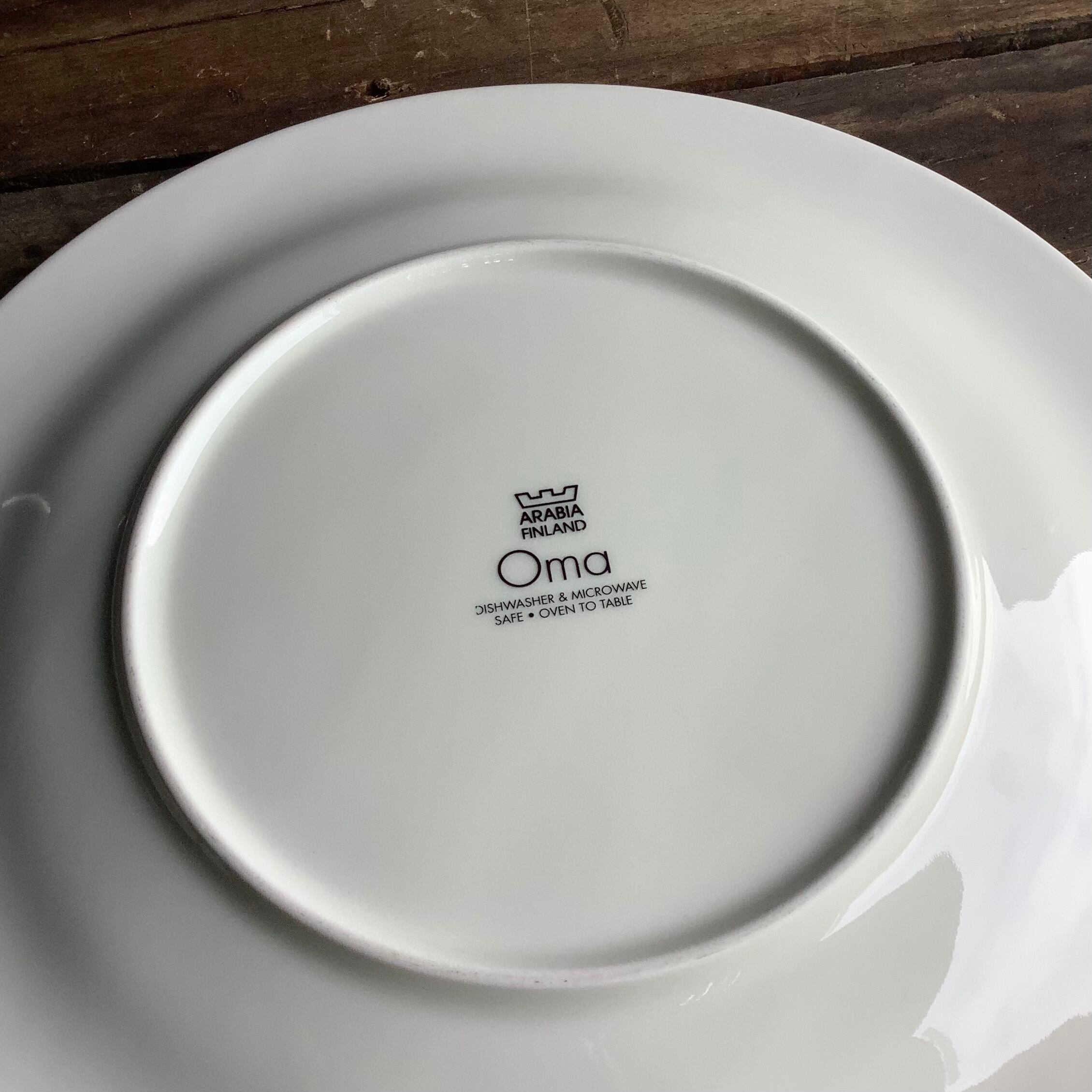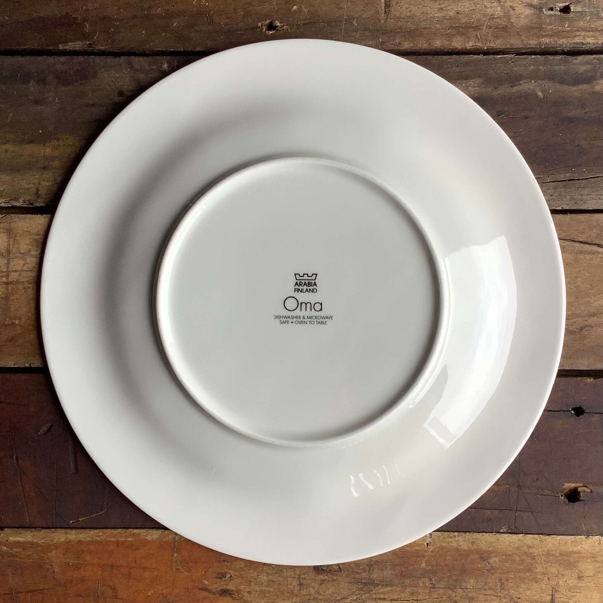 リム裏の微細な擦れ、その他細かな擦れやくすみなど座上に薄っすら感じる程度で、概ね綺麗な状態と言えます。ARABIA FINLAND Oma のバックスタンプが記され、食洗機・電子(オーブン)レンジ可とされています。