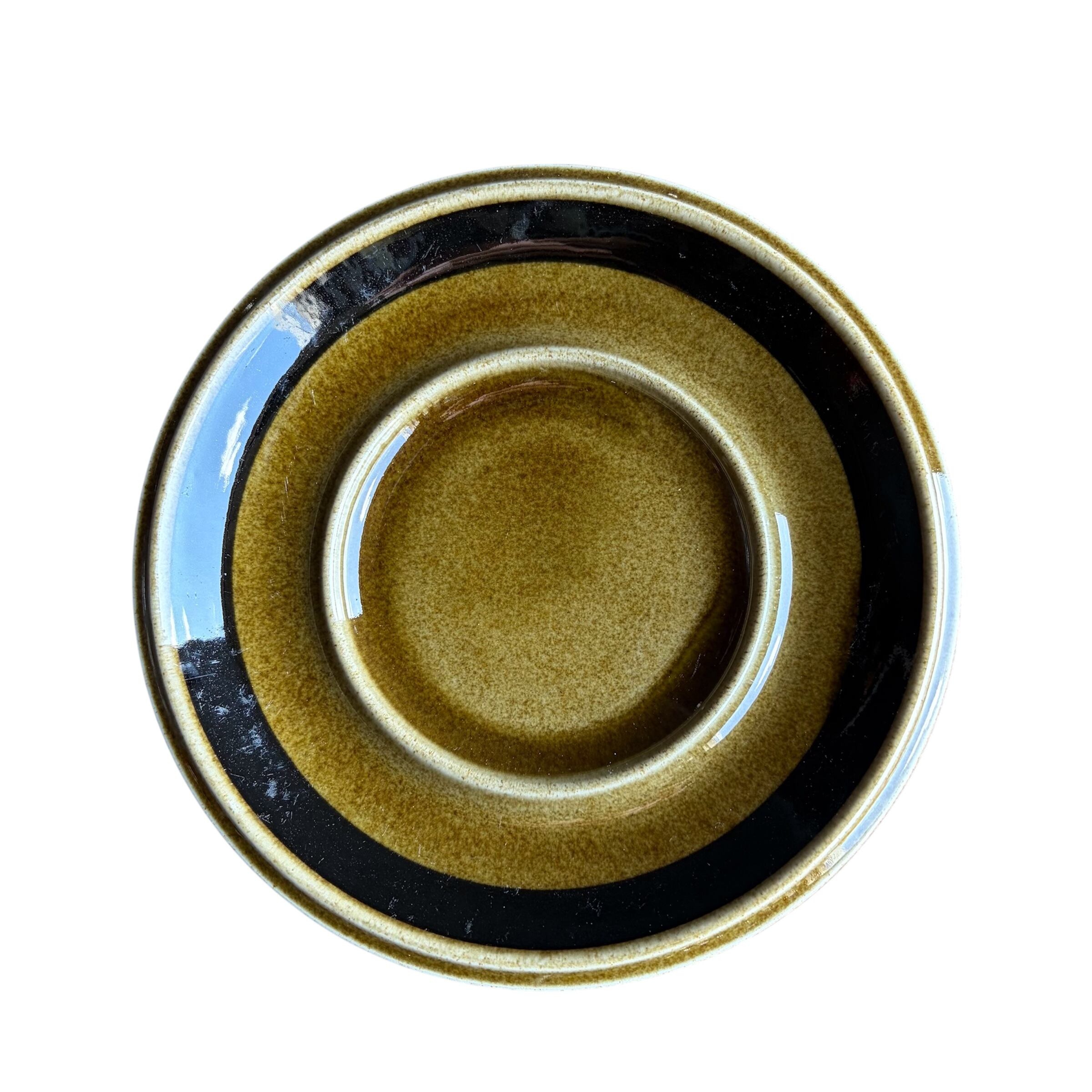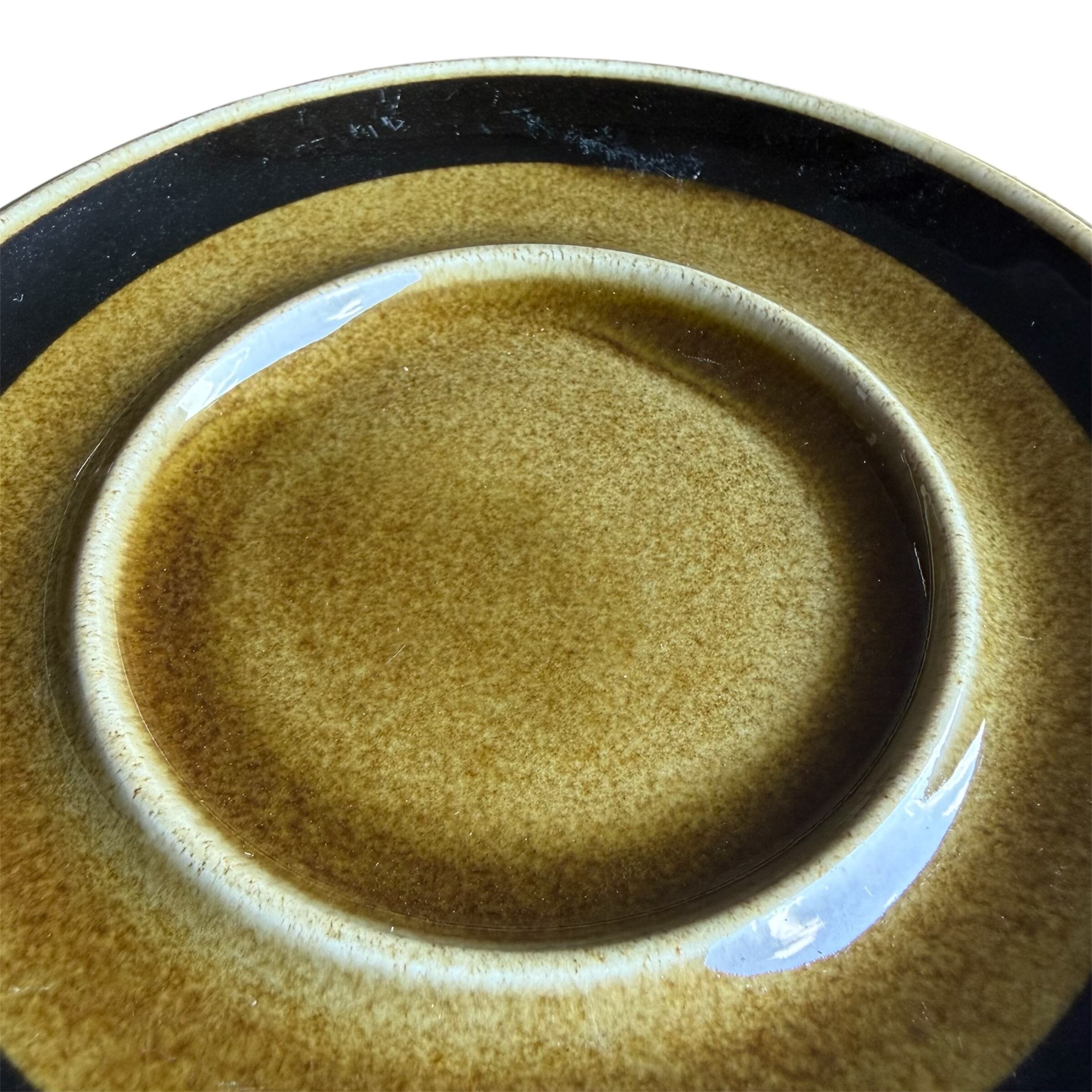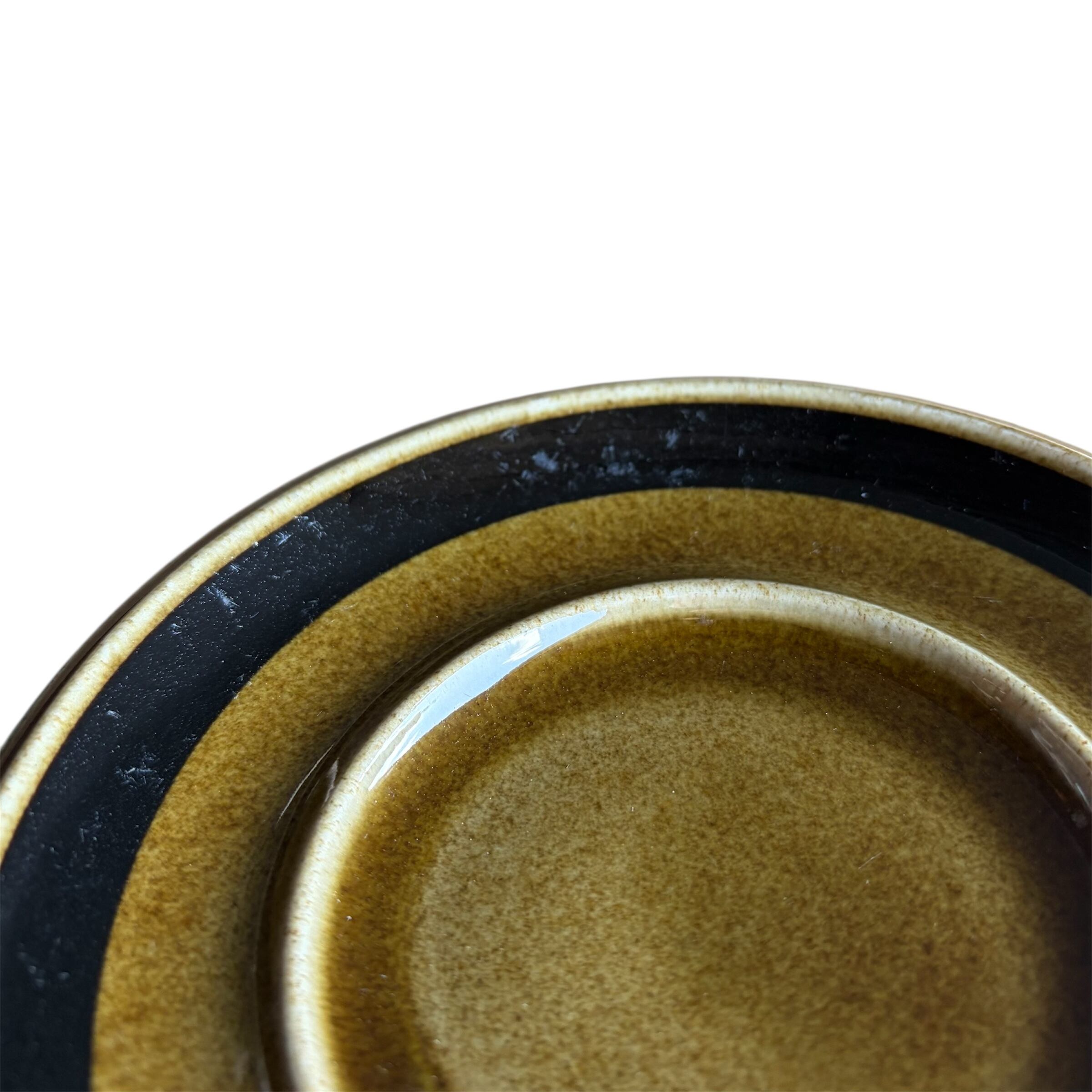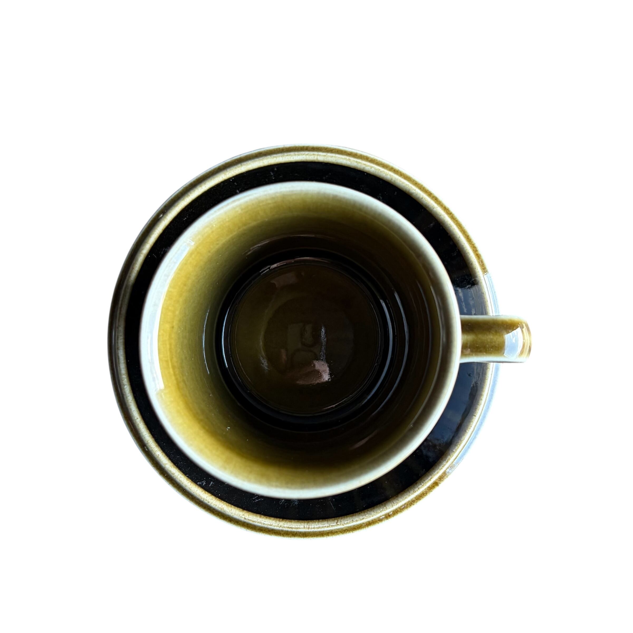縁寄りに、限りなく黒に近い色味の帯状ラインが描かれているシンプルなソーサーは上に乗るカップが様になっています。カトラリー跡やカップとの擦れと言える細かな擦れや微細なキズ、艶低下のような跡など見られたりはするのですが比較的綺麗な状態と言えます。
