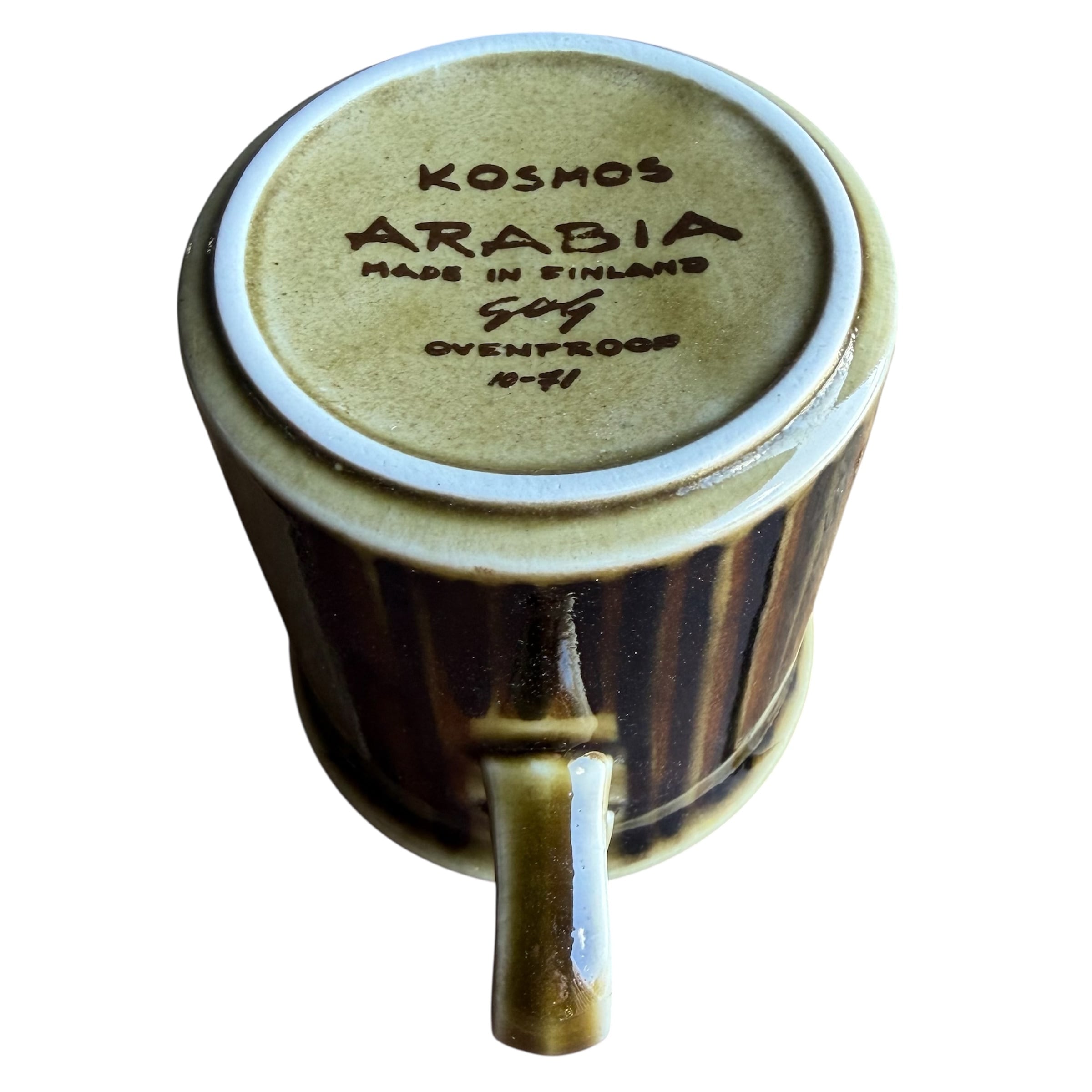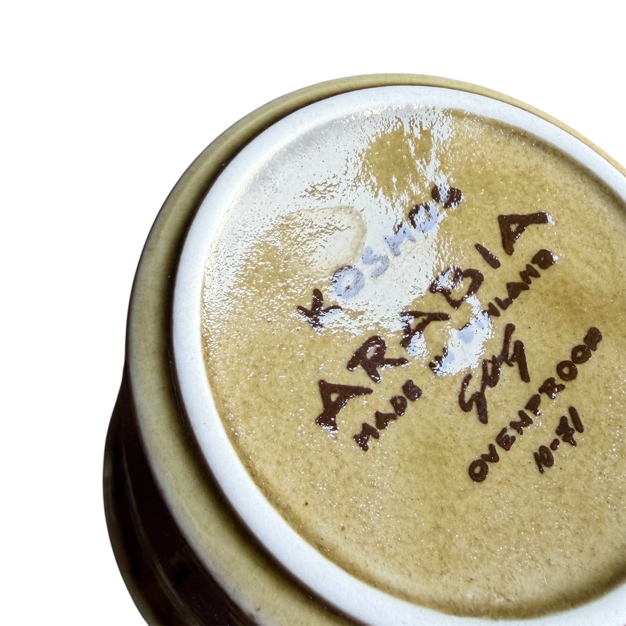 細かな擦れや微細キズ、座縁に異物閉じ込め(画像17,18)など多少見られたりはするのですが、いずれも気に障る感じの跡には思えず比較的綺麗な状態と言えます。シリーズの特徴と言える釉薬ムラ感は見られる状態です。ARABIA、kosmos などのバックスタンプが記されています。