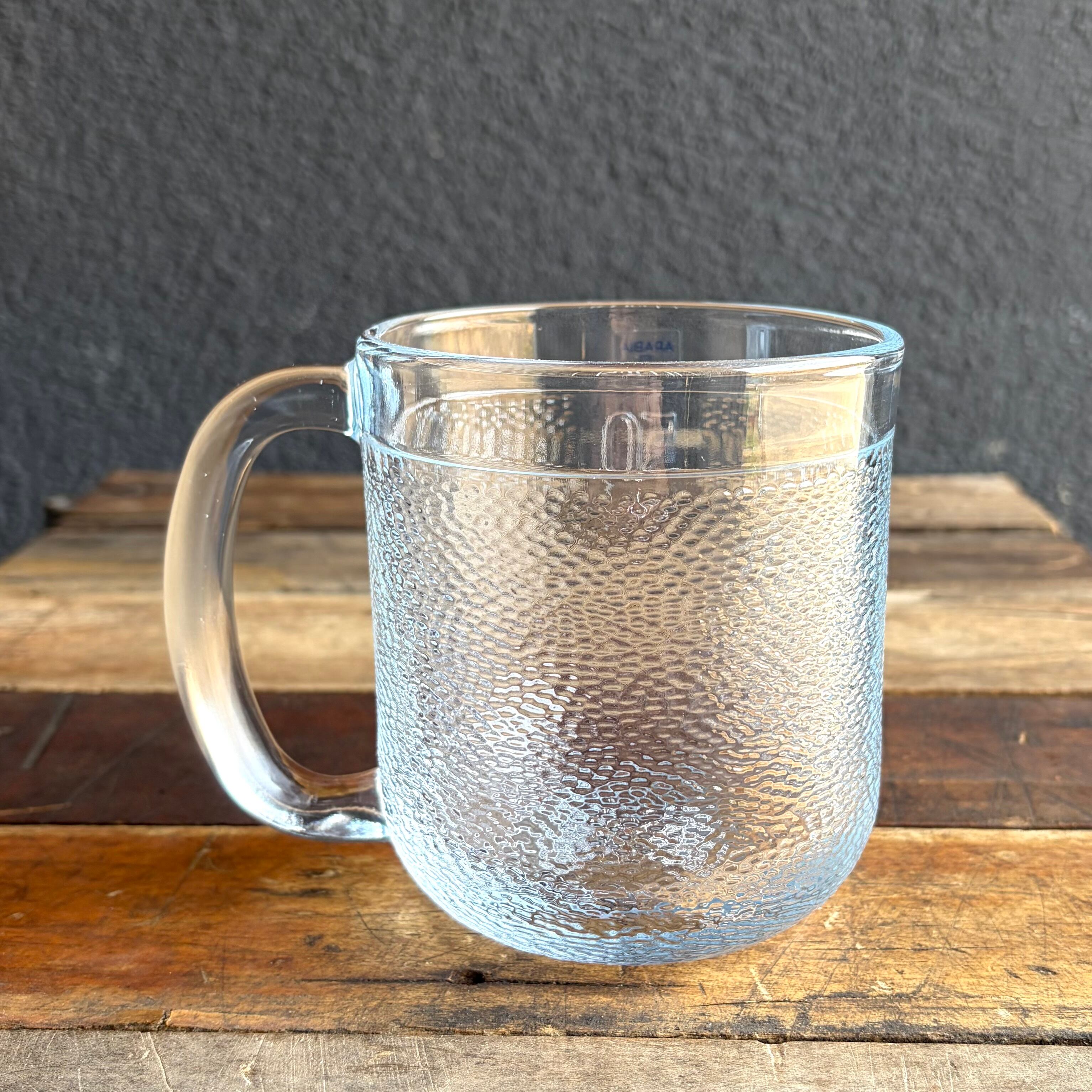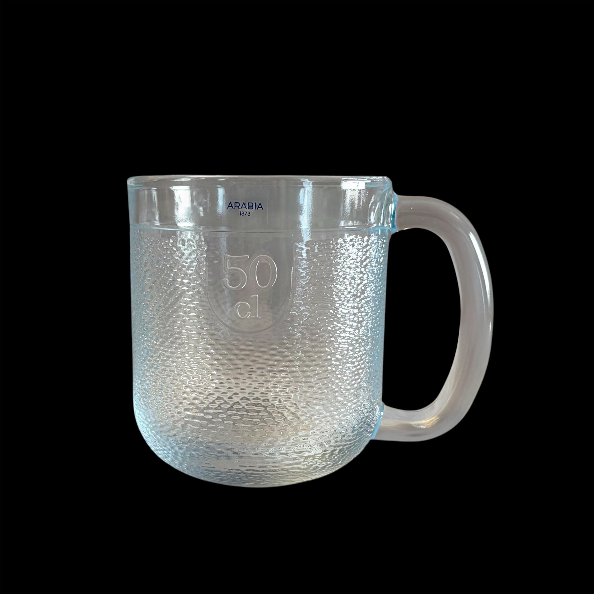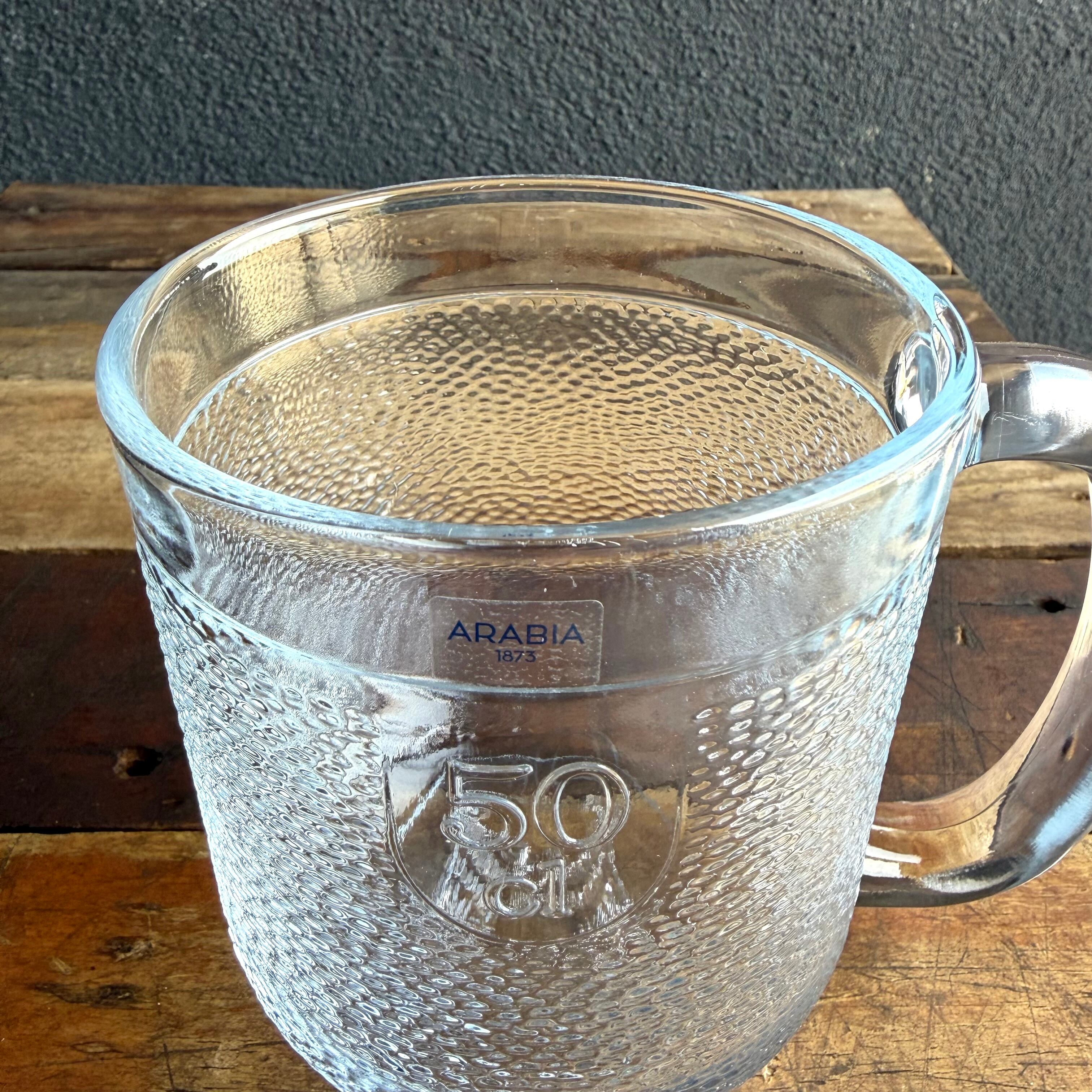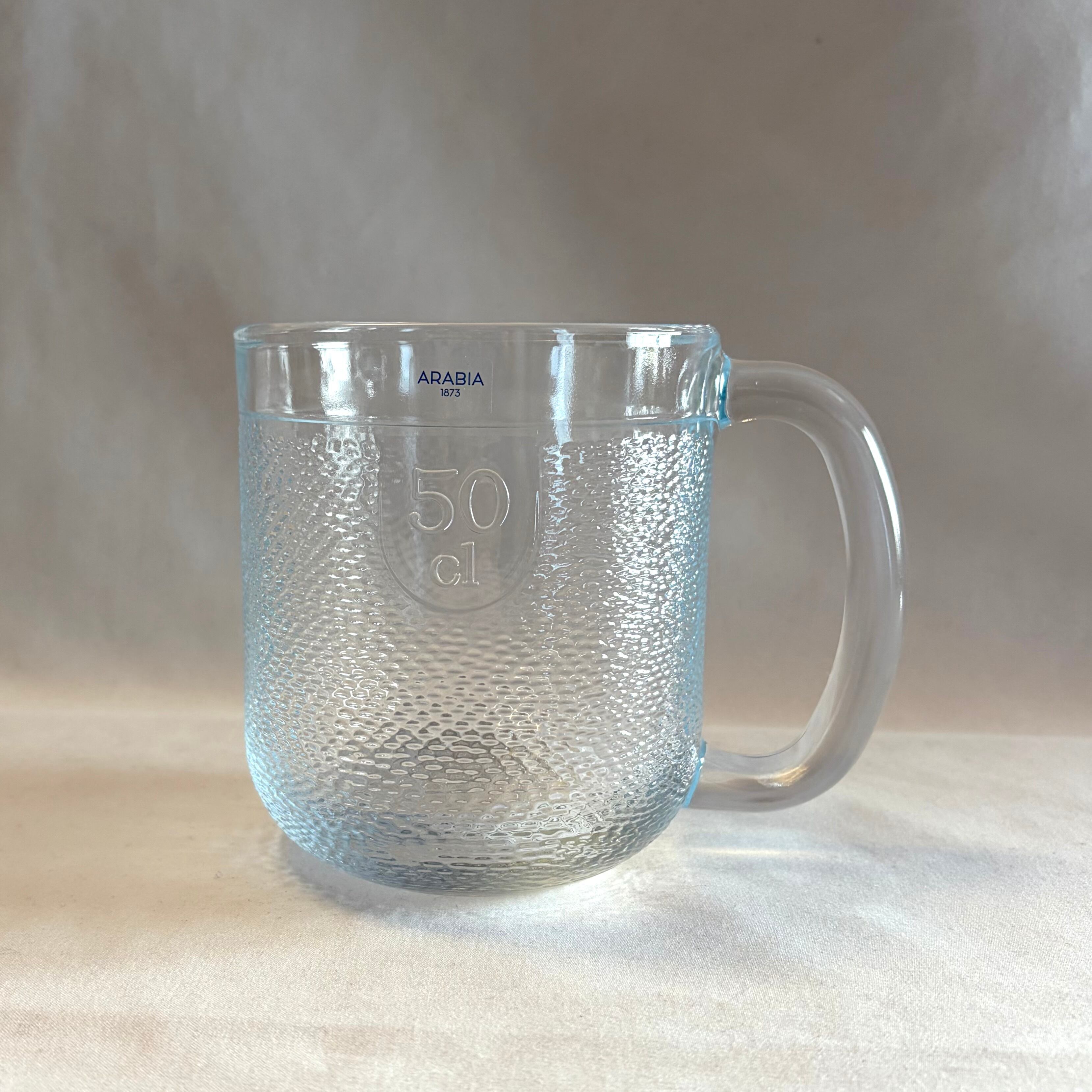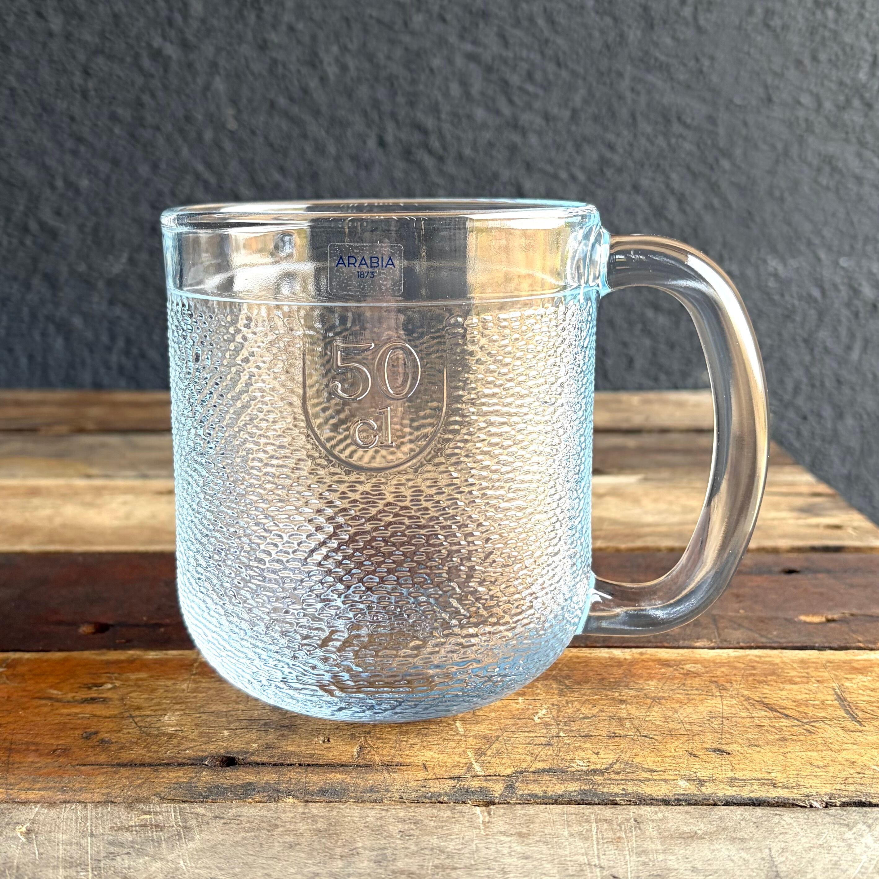 クマの毛並み肌を表現しているかの様にも感じられ、ほぼ全体に渡り細かくデコボコしていますが、内面はツルッとしています。細かな擦れなどの使用感は殆ど見当たらず概ね良好な状態と言えます。黄金色のビールなど色の付いた飲み物を注ぐと何とも言えない表情を放ち見ているだけで思わず喉がゴクッと鳴ってしまいます。側面上部のラインまで入れると 容量50 cl (500 ml)となっていますので、大まかな軽量カップにもなってくれそうです。※側面上部に ARABIA 1873 ロゴシールが残っております。