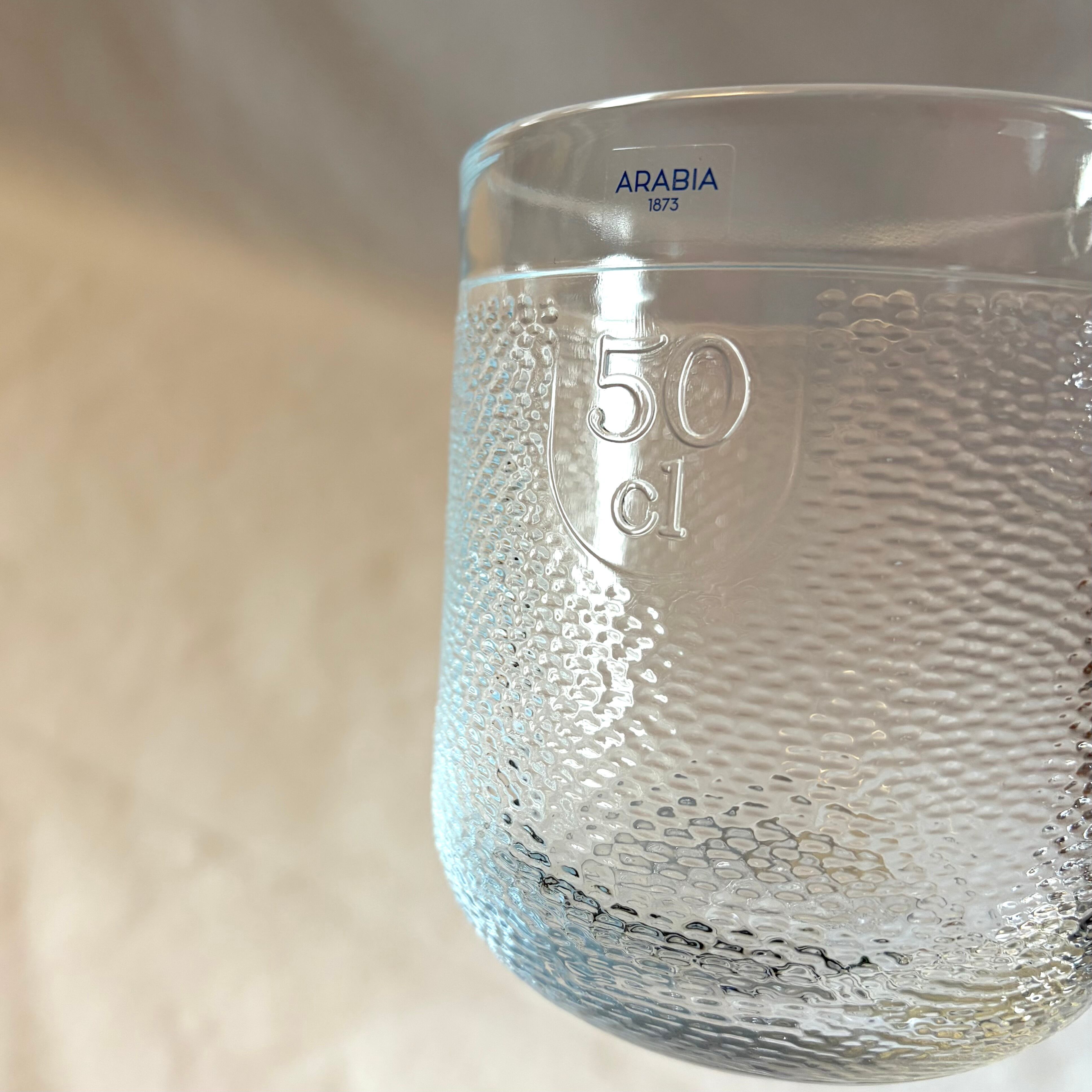 “Krouvi” は Oiva Toikka(オイバ・トイッカ)によって手掛けられたデザインです。当時、主に業務用のグラスとして製造されており、見た目からも何となく感じられる頑丈で実用性に優れ比較的近年まで製造が続けられていました。今回のARABIA 1873 ロゴシールが貼られた物とは初めての出合いとなります。