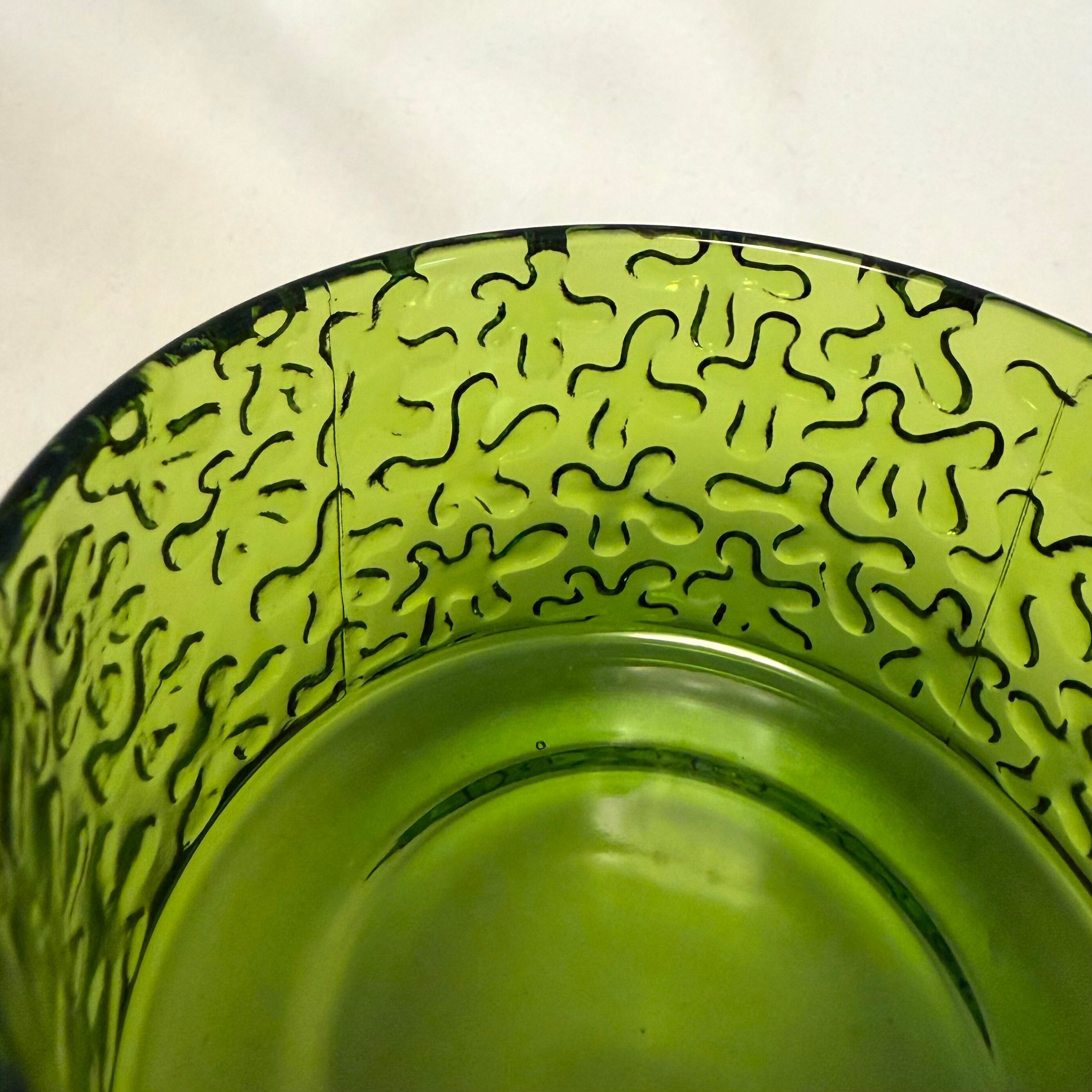 全体的にガラスに厚みがあるフォルムに大変可愛らしい模様が施され、そのギャップにも惹かれます。内面はツルッと滑らかなので手入もし易いと思います。ちょっとした焼き菓子やスイーツ、小鉢的な使い方などで活躍してくれそうです。可愛らしい個性に、今回はGreenでお楽しみ下さい。