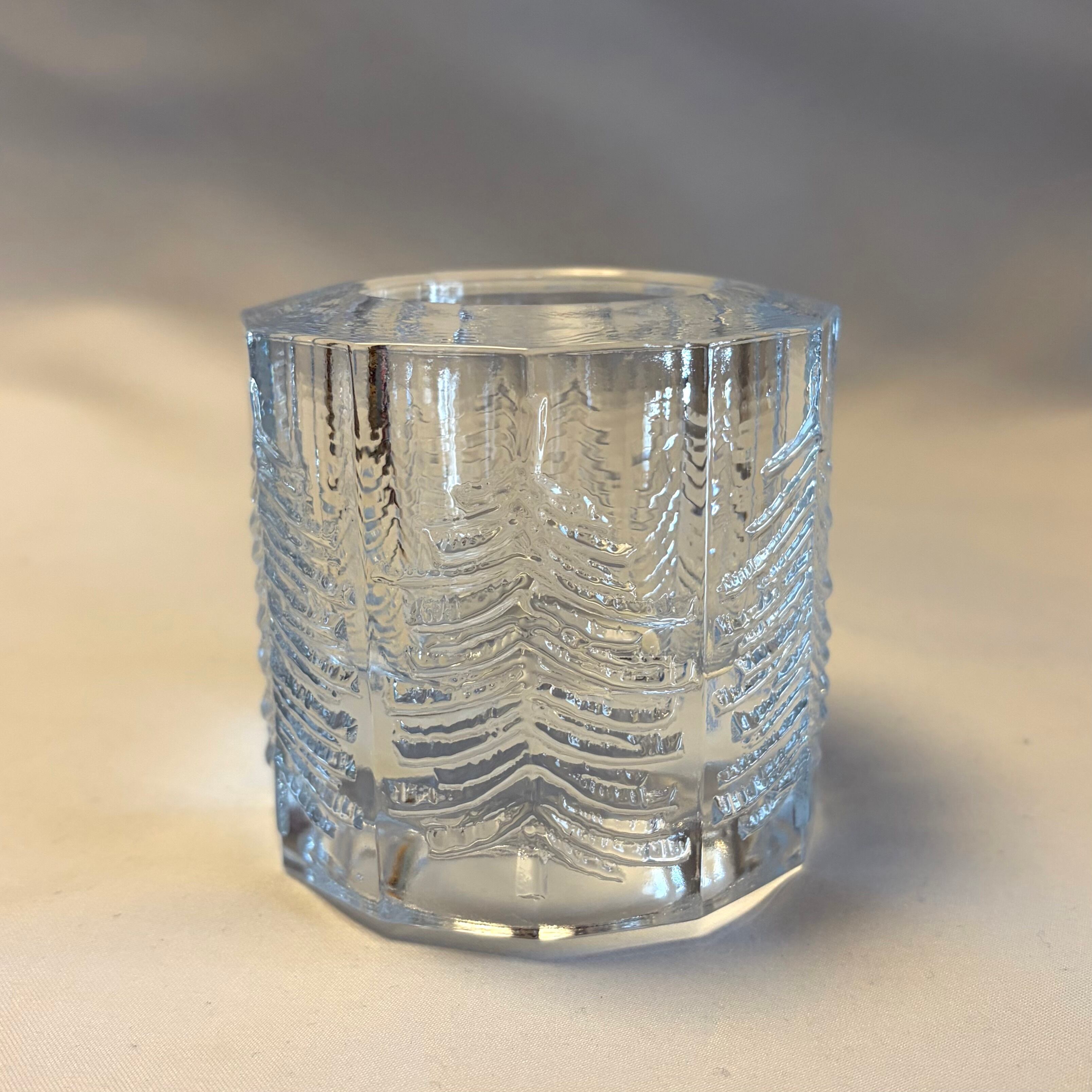 12角にカットされた表面にモミの木が6本象られています。もみの木にはそれぞれ個性がある様で、昨今の量産品などのガラス製品とは多少異なった、言葉では伝えきれない表情の豊かさを実感して頂けると思います。綺麗な状態です。