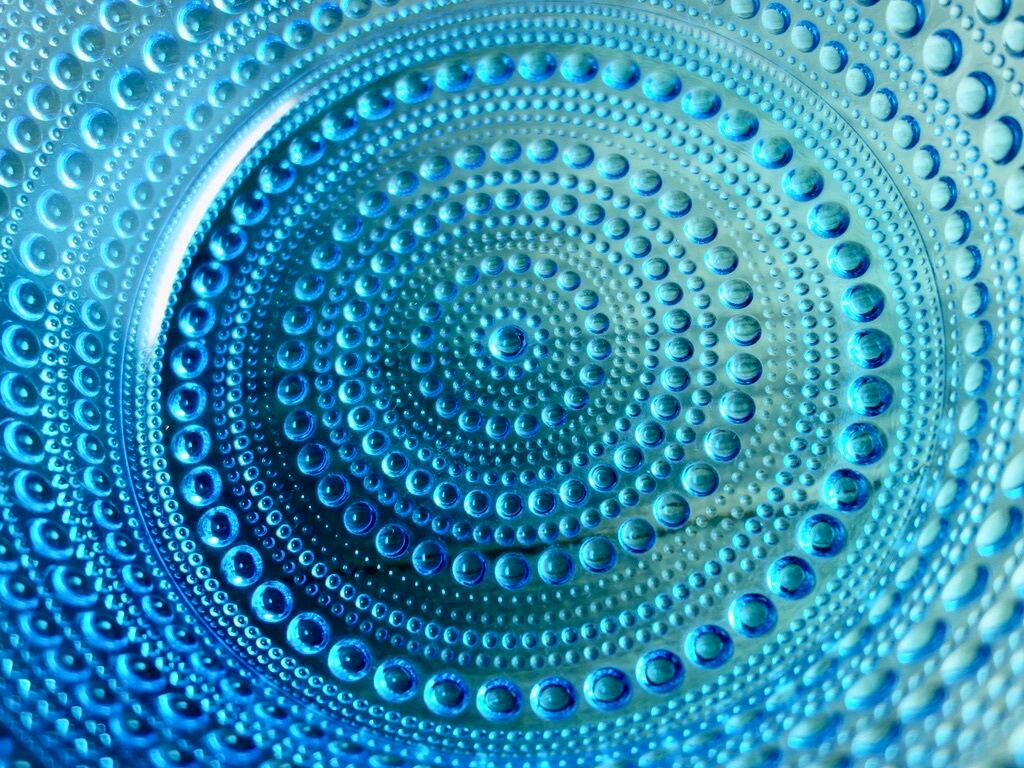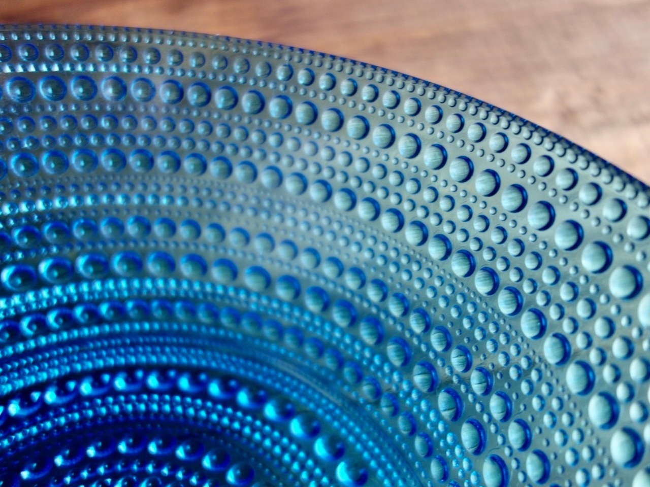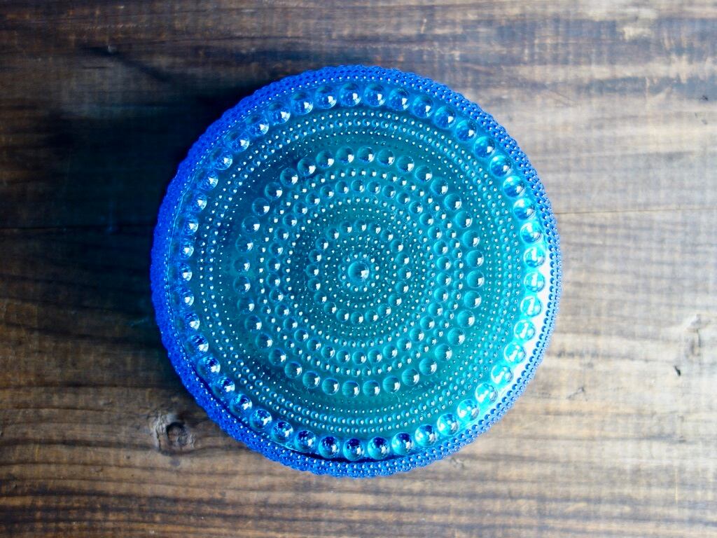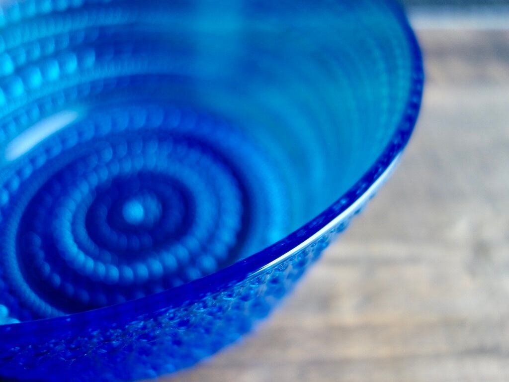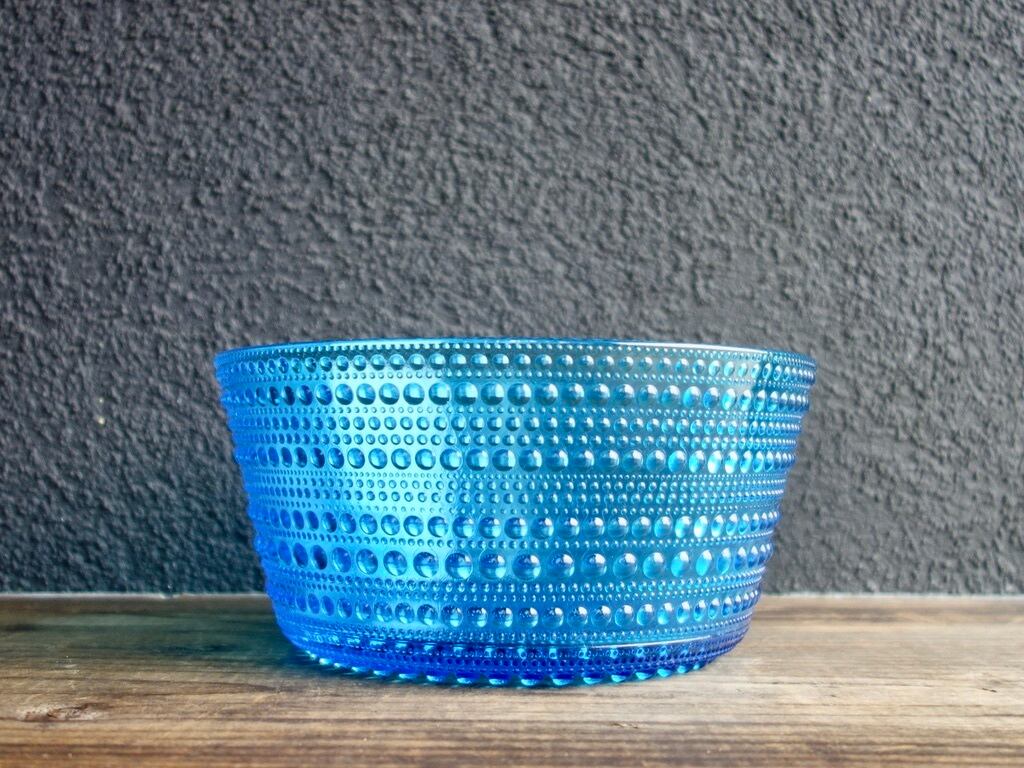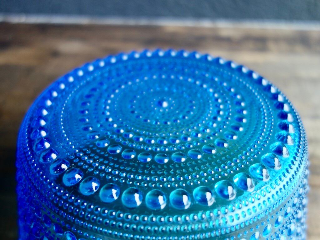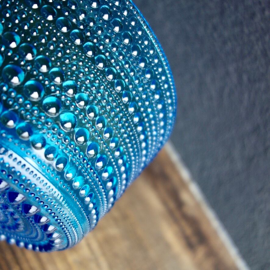 こちらの作品は当時のオリジナルのカステヘルミであり、現在の iittala(イッタラ)より復刻をされている作品とは細かな雰囲気が異なります。また、ブルー(アクア)のシリーズは復刻をされているライトブルーのものより色味が濃く、粒の一つ一つの立ち方もどこかしっかりとした印象で、どうしても復刻の作品とは違う美しさを感じてしまうのです。さらにアクアの色合いは生産数も他の色に比べると少なめで、シリーズの中でも稀少価値の高いお品とされております。深みのある美しいブルー(アクア)の色味をお楽しみ下さい。