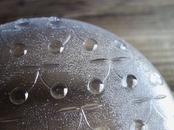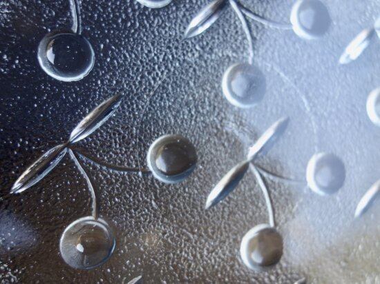 サクランボ柄は裏からエンボス加工され表面にも見えていますので表面はツルッと滑らかでお手入れし易くなっています。中央に製作跡と言えるうねりスジ(画像4)は見られるものの、その他細かな擦れやカトラリー跡など使用感は殆ど見当たらず綺麗な状態です。※表面ゆらぎによるクモリ濃淡や構造上のサークル跡(中心部)は見られる状態です。