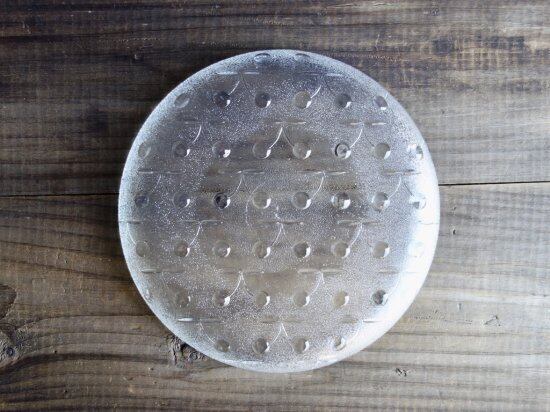 お皿のセンターに見られる跡は当店にある複数在庫全てに少なからず感じる跡と言え製作跡になります。その他細かな擦れやカトラリー跡などの使用感は薄っすら僅かで、欠けや割れなど見られないことから、時を刻んで来たガラスの器として概ね良好な状態と言えます。※ガラス製品特有のゆらぎ、シワやスジ、模様などの個体差、加工時の小さな気泡や小キズなど出ている可能性はございます。