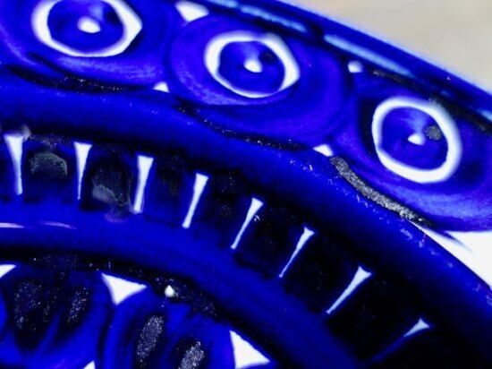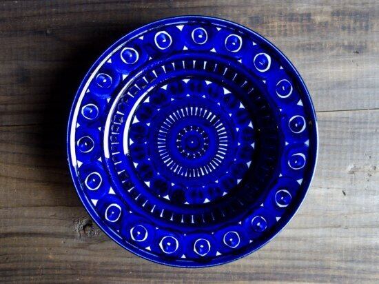 大胆でありながらも細かなタッチで手で描かれた模様には、一点一点表情が微妙に異なる魅力に溢れ、コバルトブルーのコントラストは深い藍色のような独特な釉薬によって生まれた個性と気品溢れる美しさを放っています。ヴァレンシアの新しい年代のものには裏面に記されるハンドペイントによるサインは見ることはできません。サインが見られるのは前期に生産された製品だけであり、フィンランド国内販売用に製作されたものとされています。このことから見ても、このVALENCIAは特別感のある誇らしい作品と言えるのです。