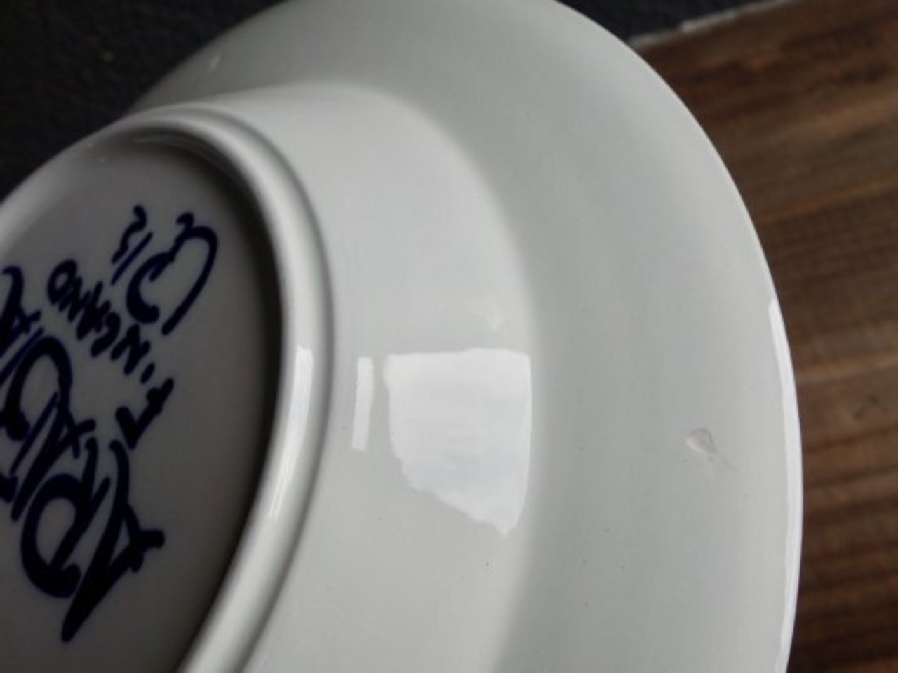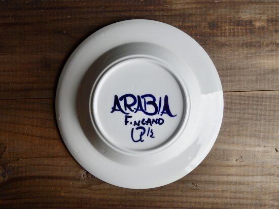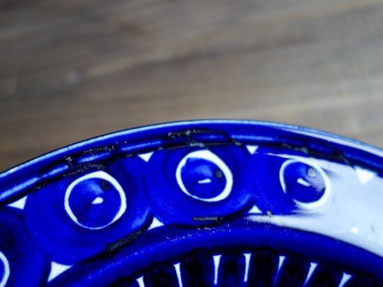 リム裏の細かな擦れや微細キズなど(画像8)の使用感は少し感じる箇所はあるものの、概ね綺麗な状態と言えます。製作跡と言える釉薬ムラや微な藍色の色移りなど少し見られる状態です。ハンドペイントによるARABIA、FINLAND、Ulla Procope、絵付師のサインが記されています。※焼成時の支柱跡(画像9)がいくつか見られます。