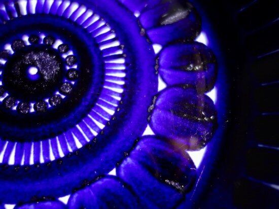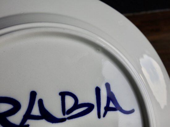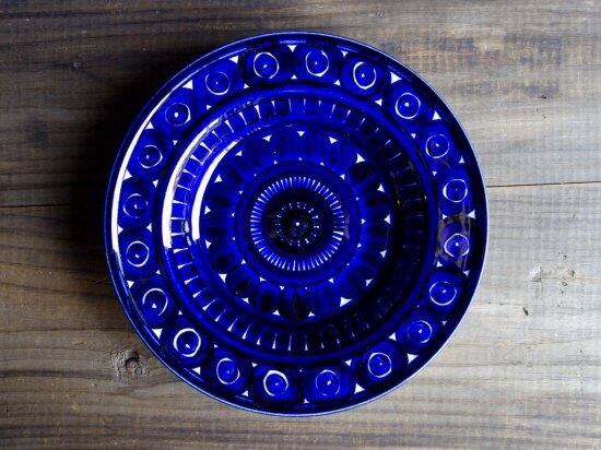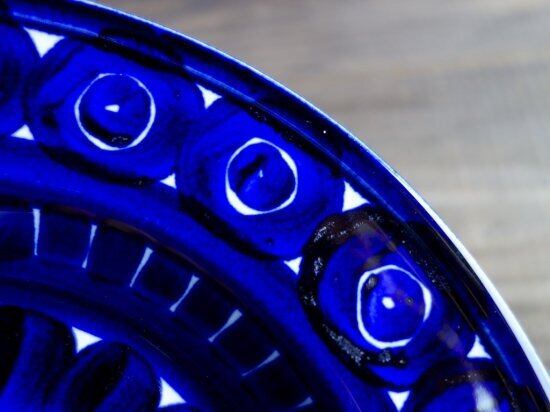 大胆でありながらも細かなタッチで手で描かれた模様には、一点一点表情が微妙に異なる魅力に溢れ、コバルトブルーのコントラストは深い藍色のような独特な釉薬によって生まれた個性と気品溢れる美しさを放っています。ヴァレンシアの新しい年代のものには裏面に記されるハンドペイントによるサインは見ることはできません。サインが見られるのは前期に生産された製品だけであり、フィンランド国内販売用に製作されたものとされています。このことから見ても、このVALENCIAは特別感のある誇らしい作品と言えるのです。