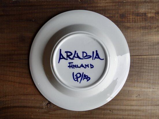 リム裏の細かな擦れや微細キズなど(画像8)の使用感は少し感じる箇所はあるものの概ね綺麗な状態と言えます。製作跡と言える釉薬ムラや高台内縁にペン先程の小さな凹跡が1つ(画像9)見られる状態です。ハンドペイントによるARABIA、FINLAND、Ulla Procope、絵付師のサインが記されています。※焼成時の支柱跡(画像8)がいくつか見られます。