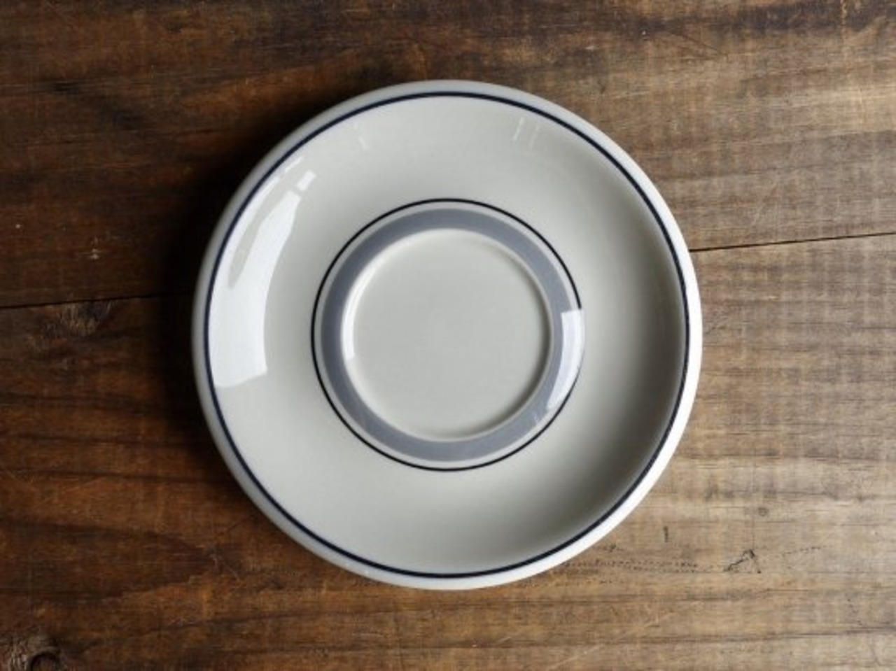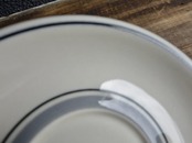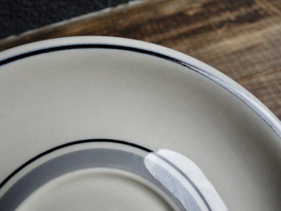 カップと同じ色味のライン使いはカップを乗せた時のつながり(すなわちトータルバランス)を大切にしているかの様です。カトラリー跡の様な細かな擦れや細キズなど(画像9,10)の使用感は多少見られる箇所はありますが、目立つ擦れ、キズ、汚れ、色褪せなど見当たらず比較的綺麗な状態と言えます。※灰色のライン上に白く見えるスジが見られますが、これは絵付けムラの様な個体差になります。