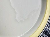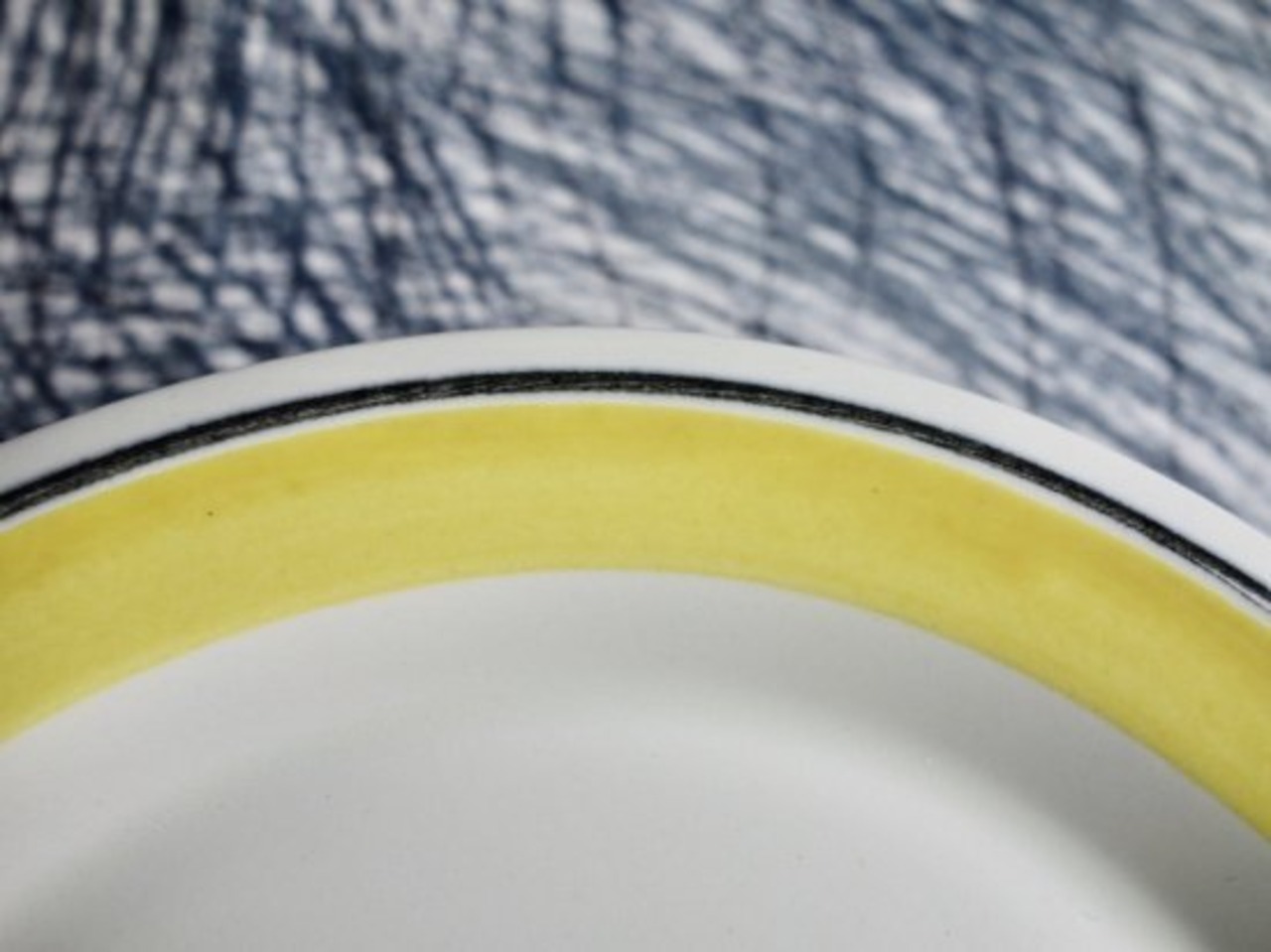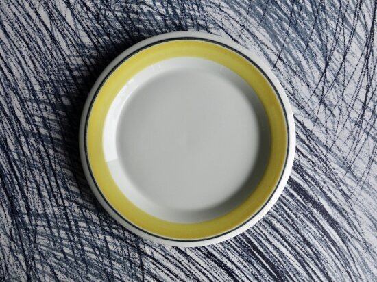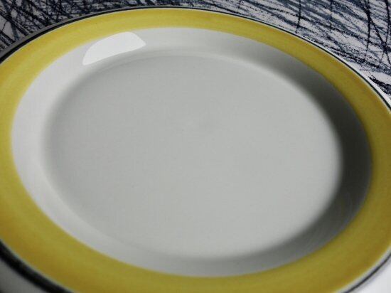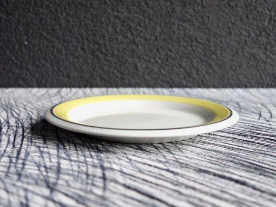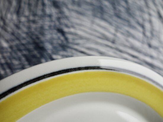 ある程度中央がくぼんだフォルムをしたプレートでスタッキングし易い仕様です。縁がオーバーハングしたリムの部分に溶き卵をフライパンに薄く敷いた瞬間の様な優しい黄色の太ラインと寄り添う様に限りなく黒に近い濃紺の様にも感じる時がある黒細ラインが引かれているのが特徴的です。目にすることは決して多いとは言えない色味だと思います。