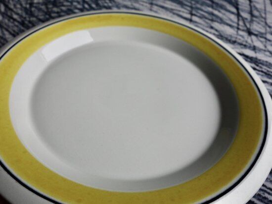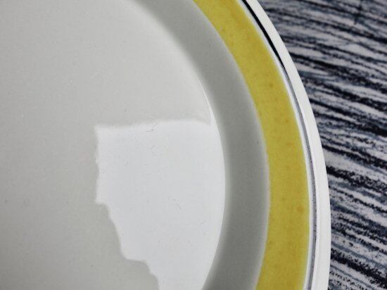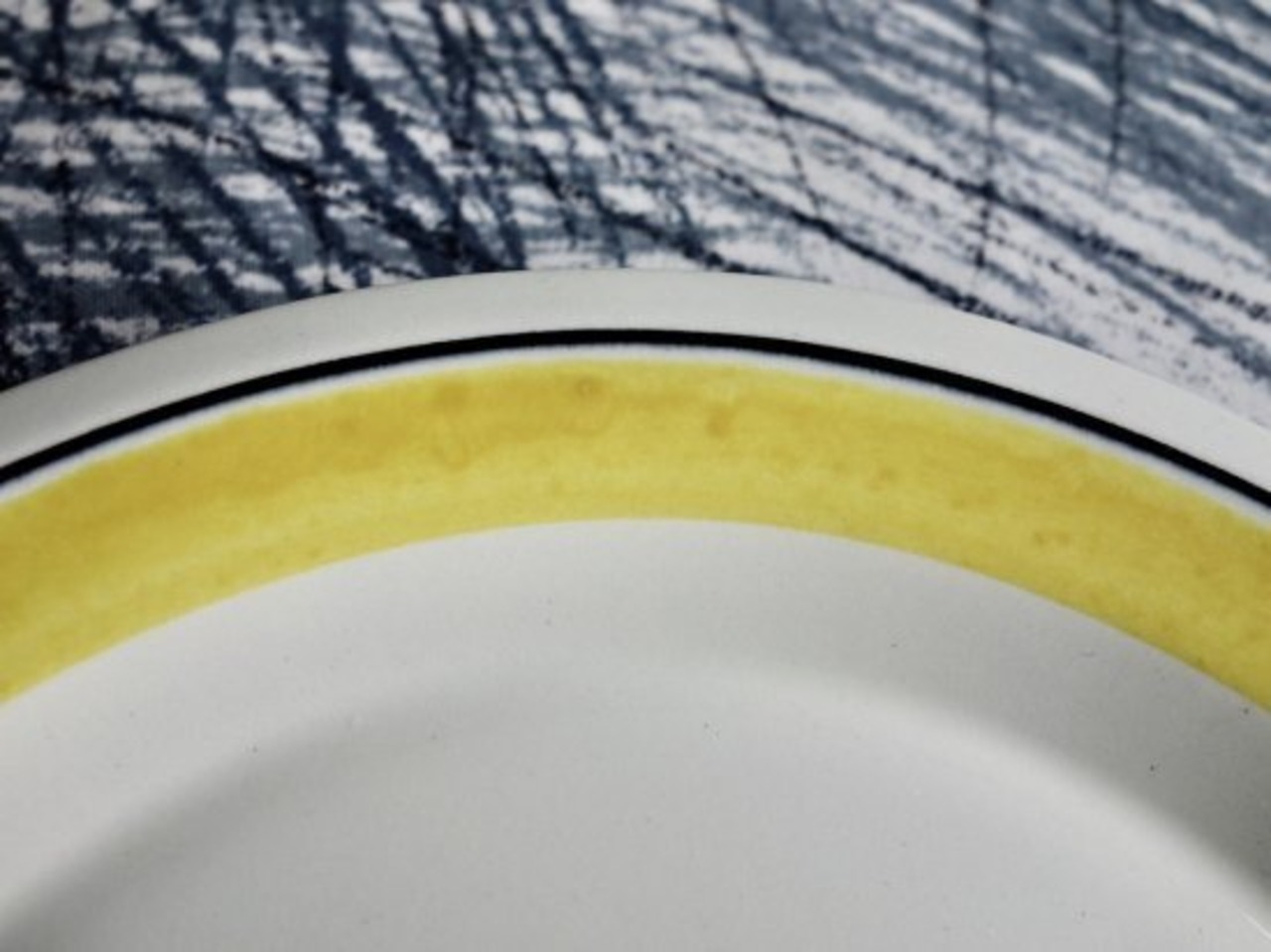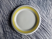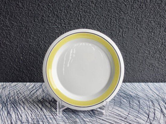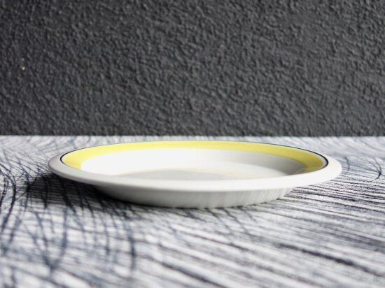 ある程度中央がくぼんだフォルムをしたプレートでスタッキングし易い仕様です。縁がオーバーハングしたリムの部分に溶き卵をフライパンに薄く敷いた瞬間の様な優しい黄色の太ラインと寄り添う様に限りなく黒に近い濃紺の様にも感じる時がある黒細ラインが引かれているのが特徴的です。目にすることは決して多いとは言えない色味だと思います。