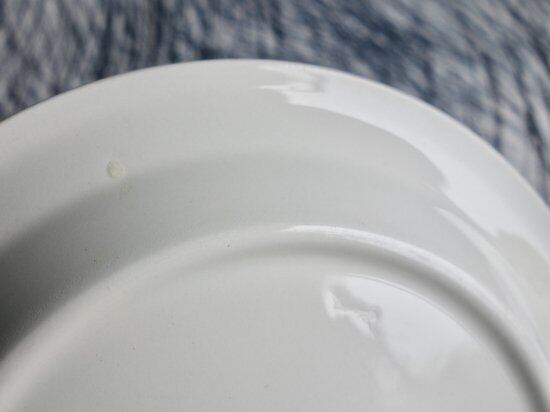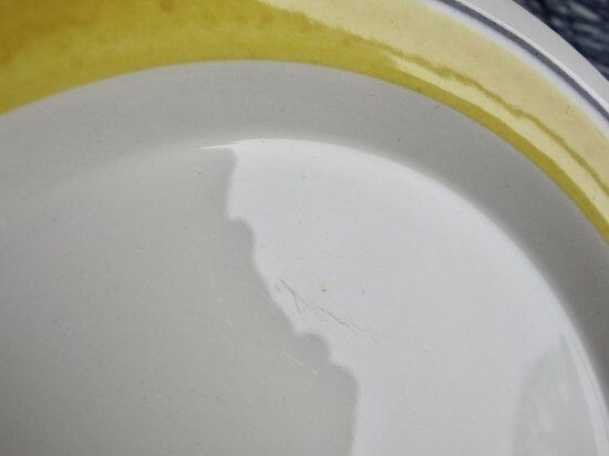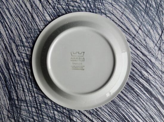 細かな擦れ、細キズや小キズ(画像9,10)、くすみ、釉薬ムラ(画像11)など少し感じる箇所はあるものの概ね綺麗な状態と言えます。ARABIA 旧ロゴバックスタンプが記されており、食洗機可とされています。※焼成時の支柱跡(画像12)はいくつか見られる状態です。