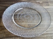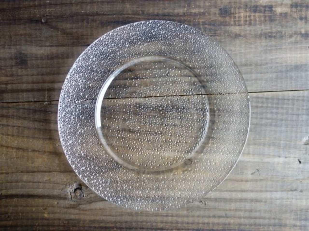 中心から渦を巻きプレート一面に広がる粒々は流れるようで、オーロラや満点の星空みたいな神秘的な表情を放っています。粒々は裏面からエンボス加工され表面はツルッと滑らかな状態です。細かな擦れやカトラリー跡などの使用感は中央エリアに薄っすら多少感じる箇所がある程度で、目立つ擦れ、キズ、汚れなど見当たらず概ね良好な状態と言えます。