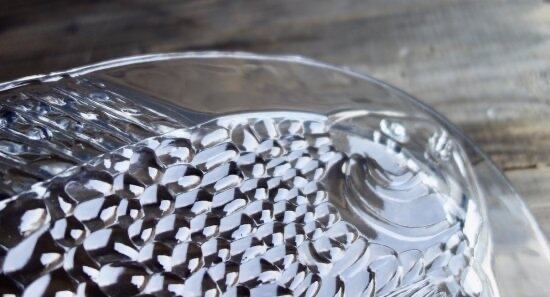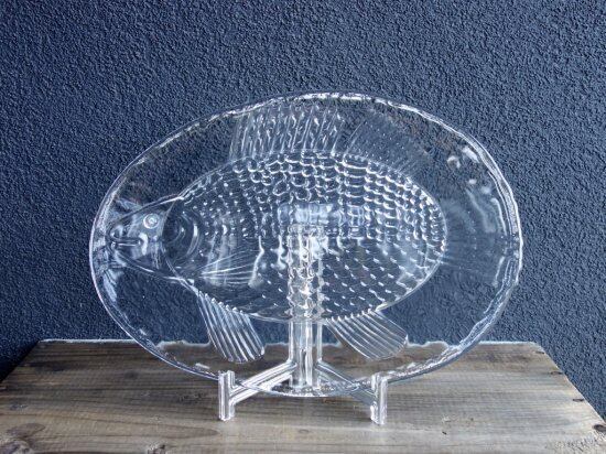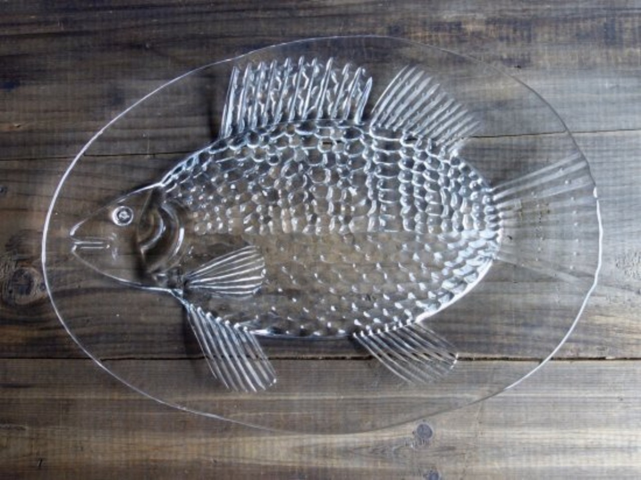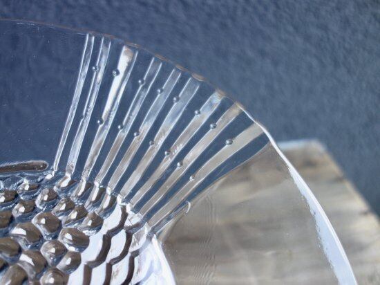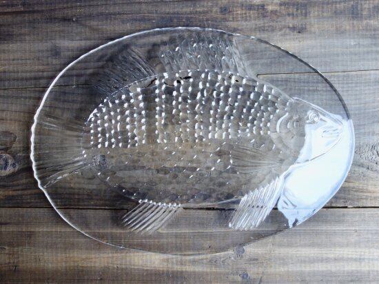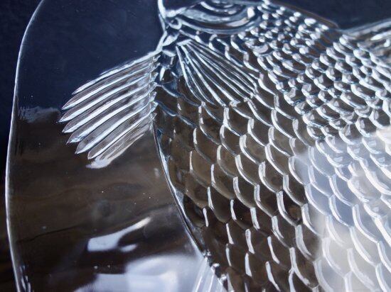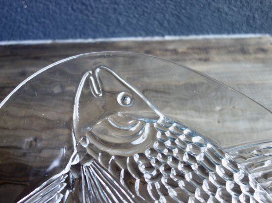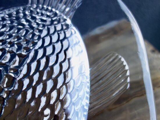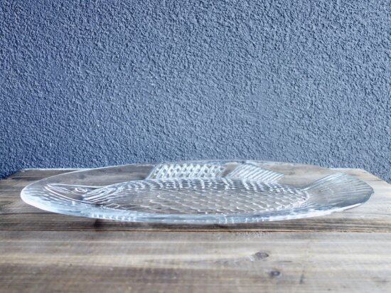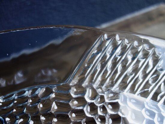 裏面からプレスされた巨大魚が表面から見えているデザインです。この面は滑らかです。あえて歪なフォルムをそのまま活かしており尾のギザギザまでもフォルム化しています。細かな擦れや微細小キズ、薄っすらとしたくもりなどは少し感じる箇所がある程度で、カトラリー跡などの使用感はそこまで感じられず概ね良好な状態と言えます。※扇状の微細線(画像10)は製作上の跡になります。