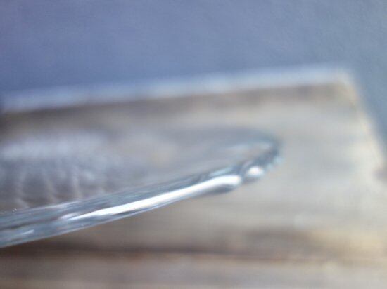 細かな擦れや微細小キズ、薄っすらとしたくもりなどは少し感じる箇所がある程度で、カトラリー跡などの使用感はそこまで感じられず、いずれも目立つ感じの跡ではなく、欠けや割れなど見られないことから、時を刻んで来たガラスの器として概ね良好な状態と言えます。※ガラス製品特有のゆらぎ、シワやスジ、模様などの個体差、加工時の小さな気泡(画像8)やキズ、くもりなど出ている可能性はございます。