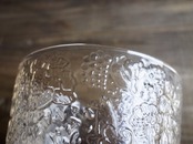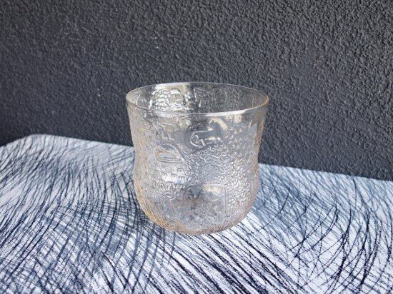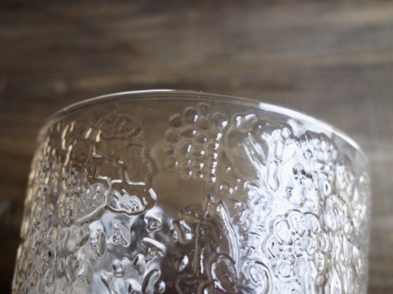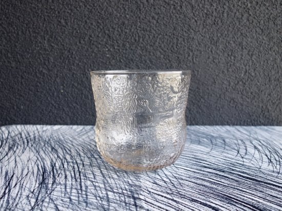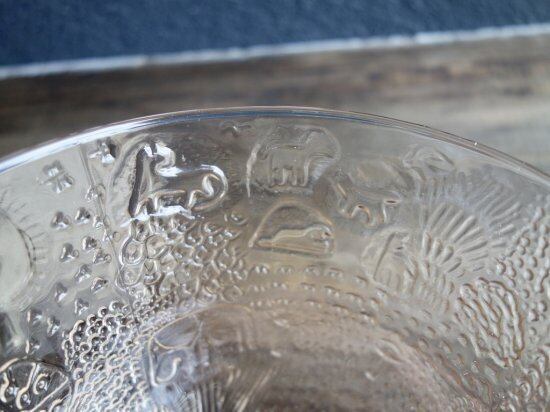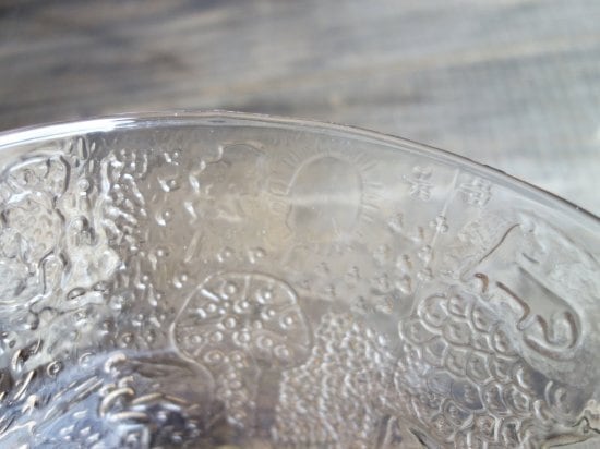 初期頃に製造されたアイテムに見られる僅かなピンクオレンジがかった色味的個体差が現れていること、ロゴシールも残っていないことから、Nuutajarvi 社にて1970 - 77年頃まで作られた "Fauna" シリーズのガラス製ボウル(クリア)と言えるでしょう。繊細なガラスの表面には、鳥達と動植物達の様子が細かく描かれ象られております。