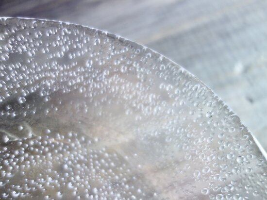中心から渦を巻きボウルフォルムで立ち上がる粒々は流れるようでオーロラや満点の星空みたいな神秘的な表情を放っています。粒々は側面・裏面からエンボス加工され表面はツルッと滑らかな状態です。微細な擦れなど薄っすら僅かに感じる程度で、目立つ擦れ、キズ、汚れなど見当たらず概ね良好な状態と言えます。