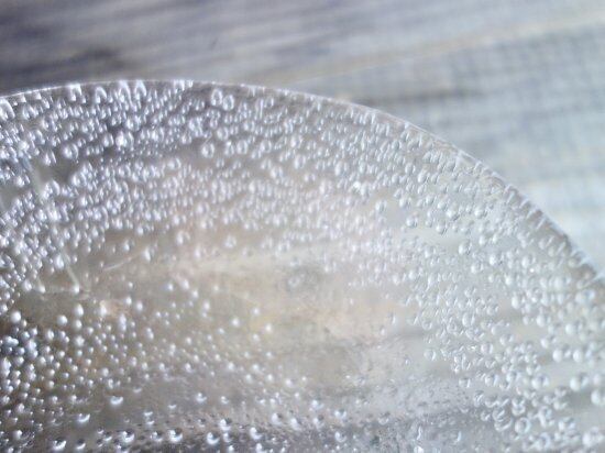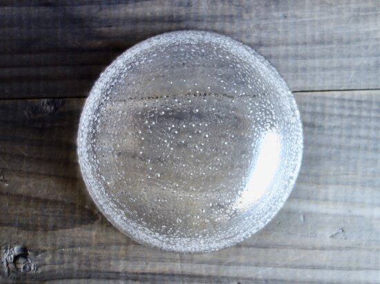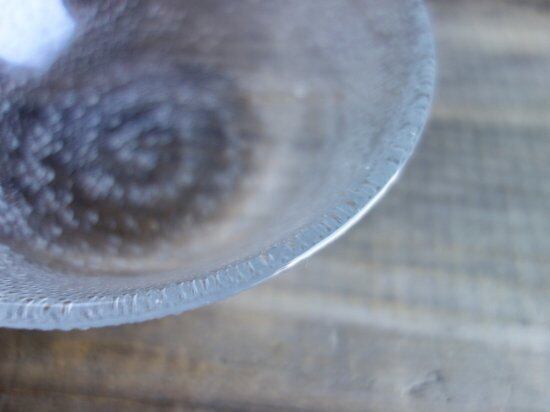 中心から渦を巻きボウルフォルムで立ち上がる粒々は流れるようでオーロラや満点の星空みたいな神秘的な表情を放っています。粒々は側面・裏面からエンボス加工され表面はツルッと滑らかな状態です。微細な擦れなど薄っすら僅かに感じる程度で、目立つ擦れ、キズ、汚れなど見当たらず概ね良好な状態と言えます。※波スジの様な跡(画像4)はガラス内部の跡になります。