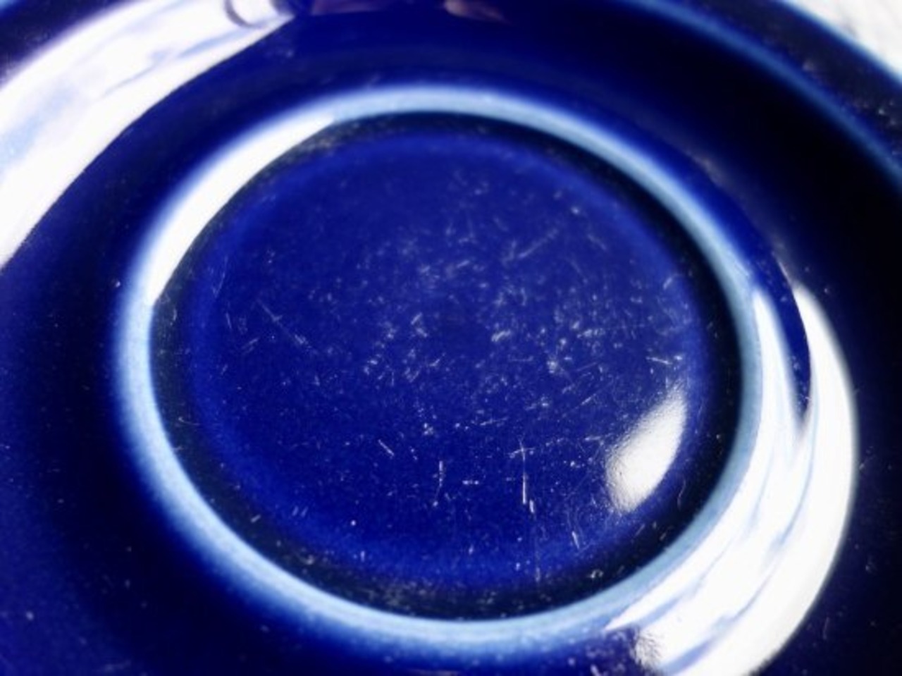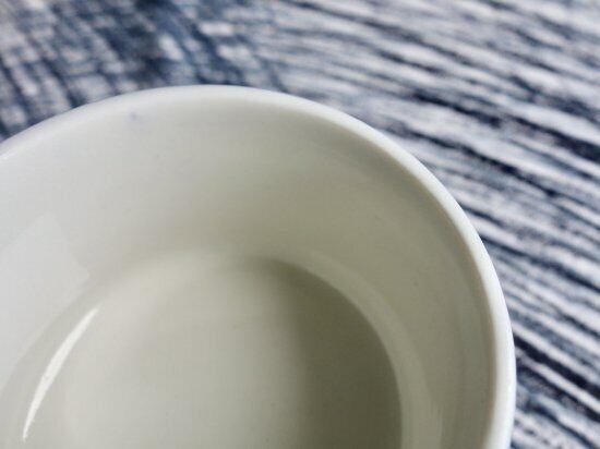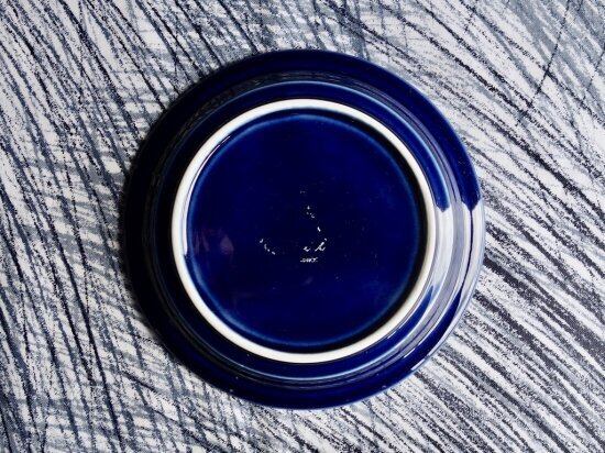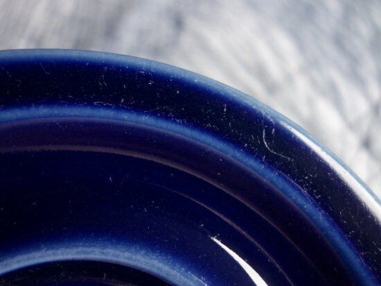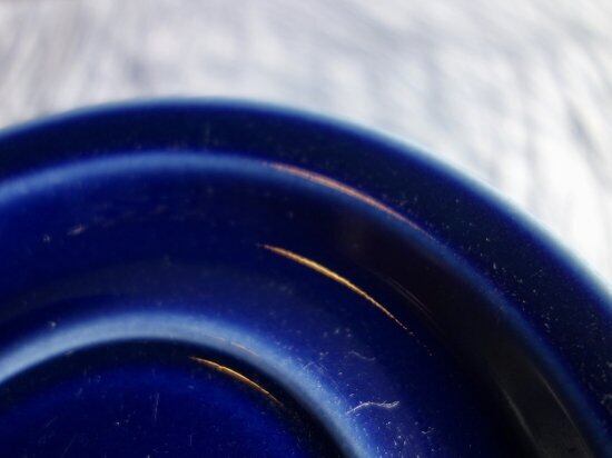内面は地の色(白)となっています。これは、おそらくコバルトブルーの中に白い部分が見えコーディネートなどの際に美を追求したものと思われます。底面などにカトラリー跡と言える細かな擦れや細キズなどの使用感は多少見られ、色移りや微黒点など感じる箇所はあるものの、いずれも目立つ感じの跡ではなく概ね綺麗な状態と言えます。