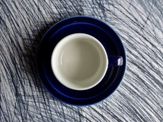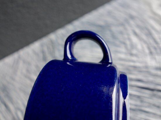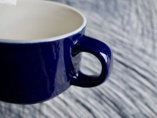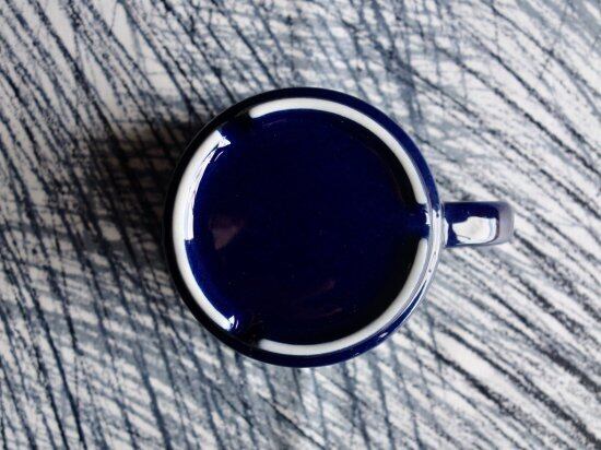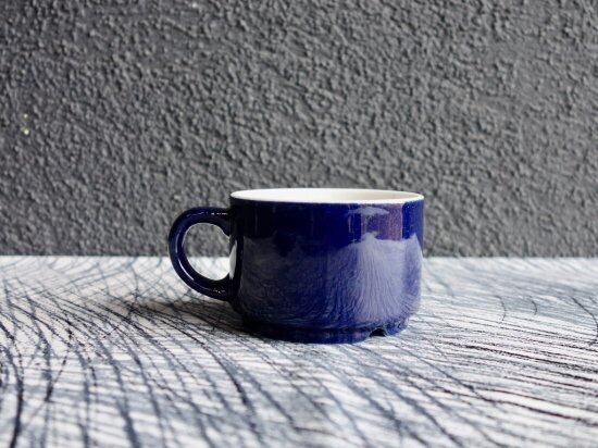 “Kievari” は Kesti や Kerho の 頭文字が "K" のシリーズで、区別し難い程見た目と仕様共に似ており、ホテルやレストランなどで使用する業務用の器として Goran Back(ゴラン・バック)によって手掛けられました。実用性に富んだシンプルで丈夫な作りには業務用という過酷な条件下でも耐えうる機能美的要素を踏まえた設計思考の様なものが読み取れる器と言え、側面の深海の様なコバルトブルーの色味と飲み物が映え、内側白との切返しにも惹きつけられます。