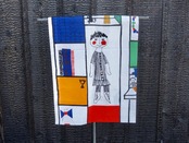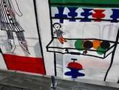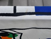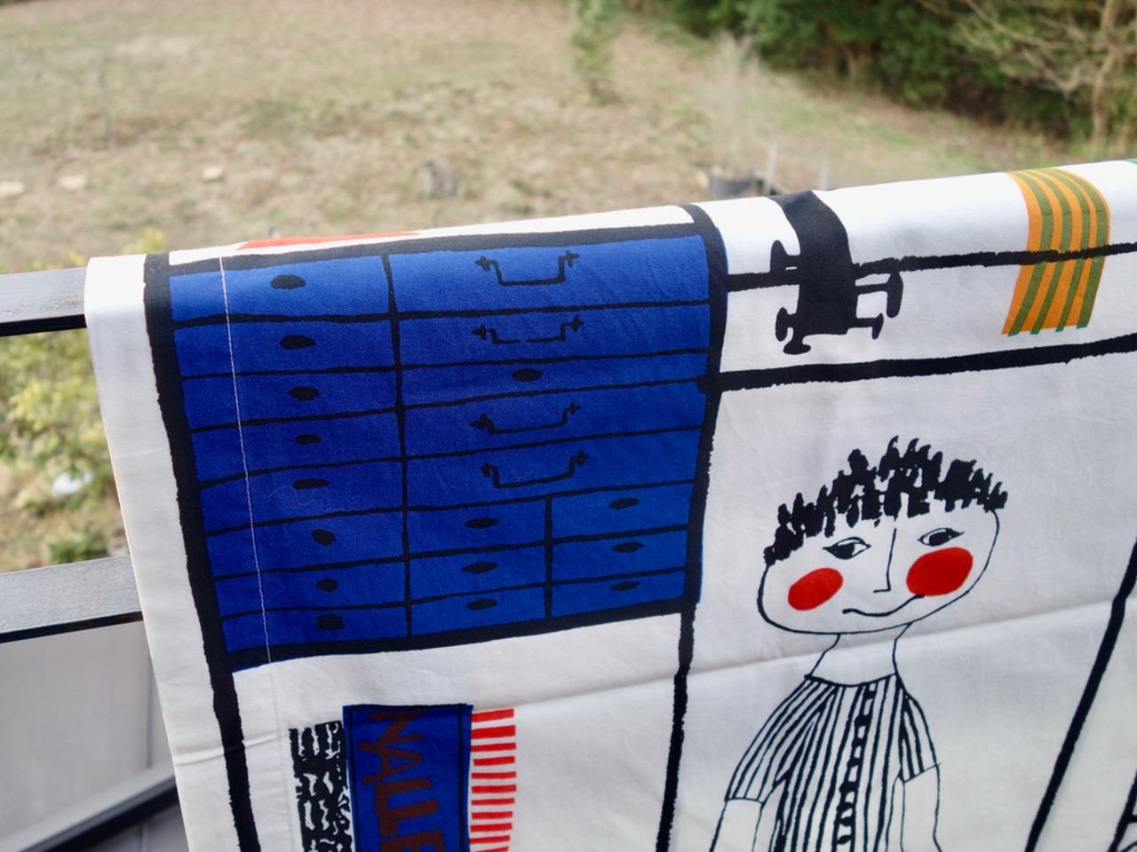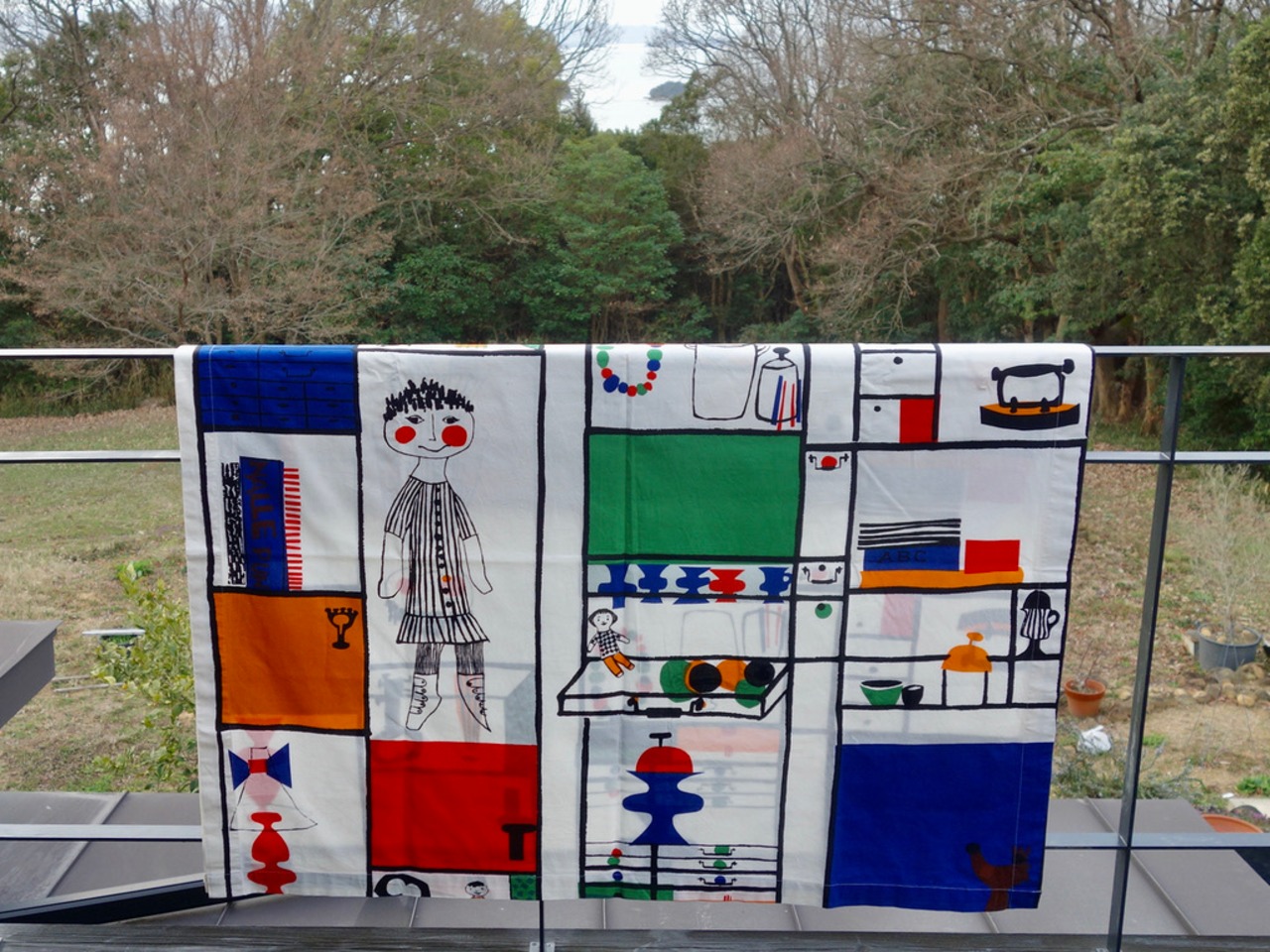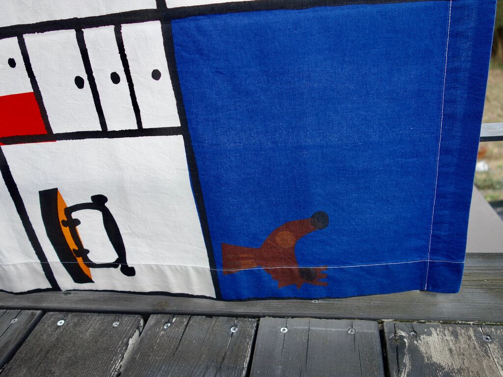 子供達の愛用小物などを大切に棚に収められている様子はきっと宝棚なのでしょう。優しくて可愛らしいタッチで描かれているので、子供から大人まで楽しめるデザインに描かれています。生地中央より右上辺りの薄茶色の汚れ(画像16)や小さな飛びシミのような跡など使用感は感じる箇所はあるものの、くすみなどは薄っすらで、目立つ擦れ、汚れ、色褪せなど見当たらず概ね綺麗な状態と言えます。